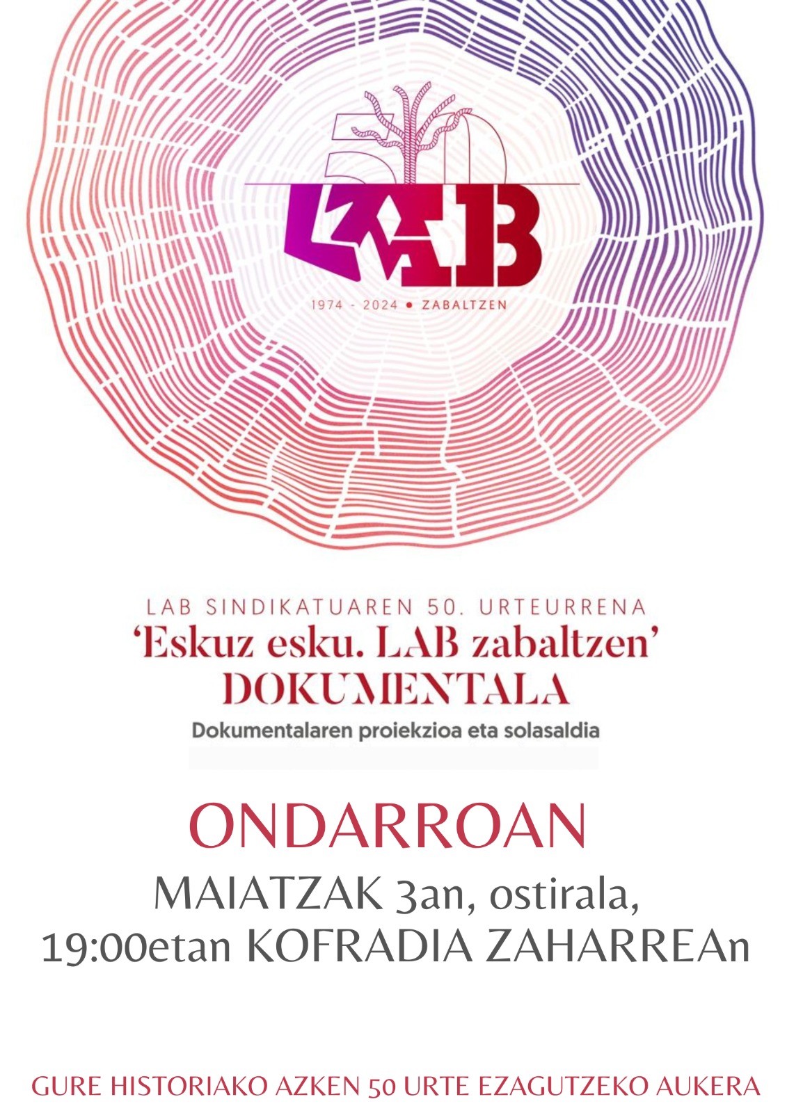 Ongo baixakun L.A.B sindikatun 50. urteurrenan inguruko dokumentala eskeiniko dabe Kofrai Zaharrin arratsaldeko 7retan. Iñor gogoratzen da Ondarruko L.A.B.en lelengoko egoitzi nun euan? San Juan Txurrun! Lelengoko billerak, lelengoko borrokak, lelengoko karnetakin, zabalkundiaz, krisisakin, pankartak, idatzixak…Dokumentalaz gain mahai inguru be eingo da, lelengoko militantikin, delegaukin eta ingurukukin. Hurreatu gogoratzeko eta aurrea begirako erronkak elkarbanatzeko! Gora L.A.B.! Bihargiñan sindikatu!