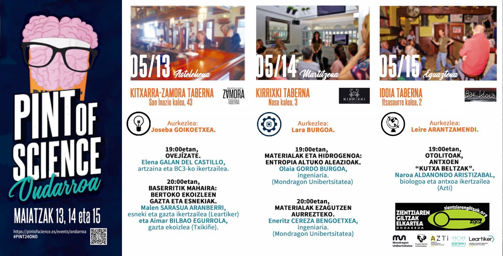 Zientziaren Giltzak Elkartik antolatu dau aurten be PINT of SCIENCIE ekimena herriko hainbat tabernetan, KITXARRA-ZAMORAn, KIRRIXKIn eta IDOIAn. Azpixan dakazuez, egunak, orduk, gaxak eta zeintzuk ixango dizen hizlaxak. Jakin-naxe badakazue, ez galdu aukera hau!