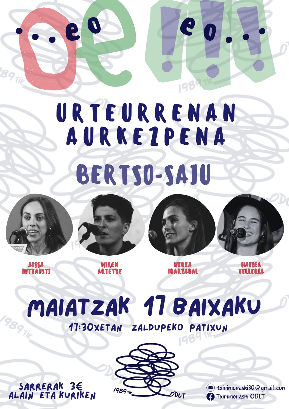 Bertso saio ederra antolatu dabe TXIRRIMORRASKIn 35. urteurrenan ospakizunan barrun datorren baixakurako arratsaldeko 5:30xetan Zaldupe eskola publikoko patixun. Taula gañin, AISSA INTXAUSTI, MIREN ARTETXE, NEREA IBARZABAL eta HAIZEA TELLERIA eongo diz. Sarrerak aurretixaz eongo diz saltzen, ALAI tabernan eta KURIKE dendan 3euron trukin. Galdu eingozu?