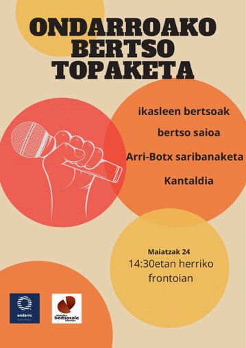 Bixar, Baixaku (maiatzak 24) Ondarruko Bertso Topaketi eingo da herriko frontoin eguerdiko 2:30tatik aurrea, Zaldupe eskolako eta Zubi Zahar herri ikastolako LH6ko ikaslin eskutik. Hurreatu frontoire etorkizuneko bertsolaxak entzutea!