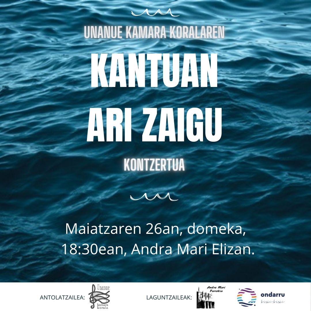 Musikazalik gazenontzako plan ona antolatuzku bixar arratsaldeako Unanue kamara koralekuk, KANTUAN ARI ZAIGU kontzertu. Gogoratu emanaldixe arratsaldeko 6:30xetan hasiko dala eta Andra Mari elixan ixango dala. Gozatu belarrixak doiñu ederrakin!