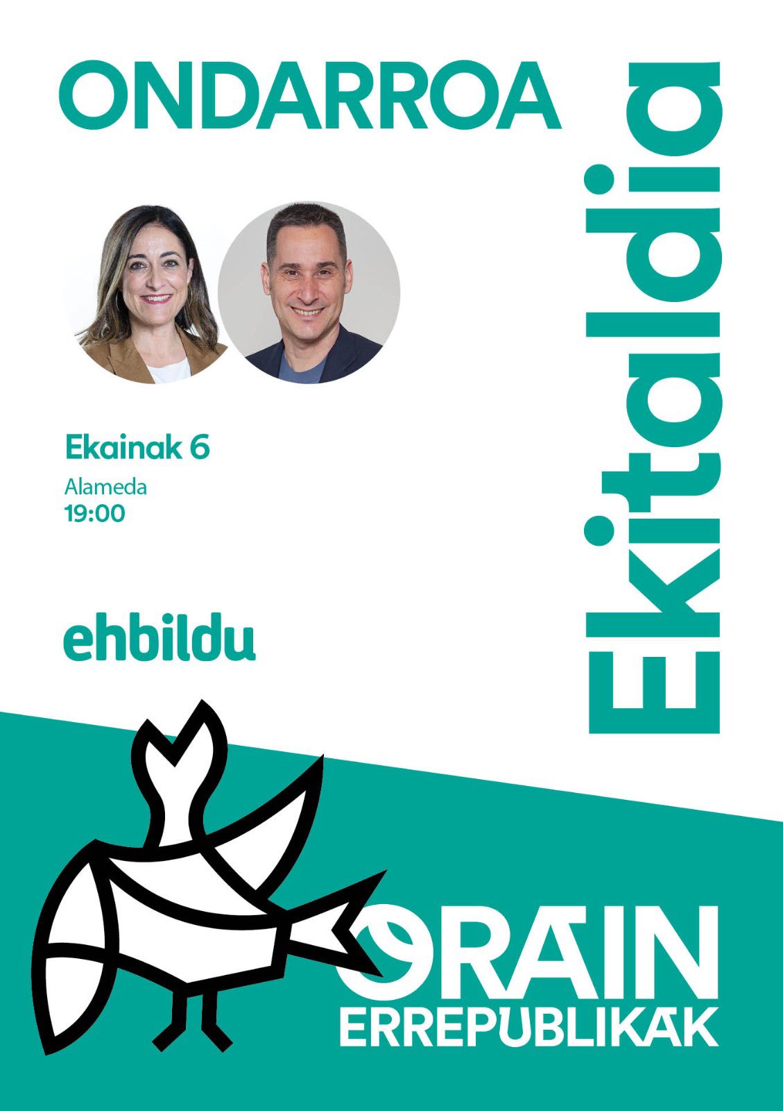 Gaur arratsaldin 7retan EH Bildun ekitaldixe eongo da Alamedan Europear parlamentuko hauteskundiai buruz. Hizlari lez IDURRE BIDEGUREN GABANTXO eta IKER CASANOVA ALONSO eukikouz….eta domekan (E-9)xan, bozkatu Orain Errepublikak! Bozkatu EH Bildu!