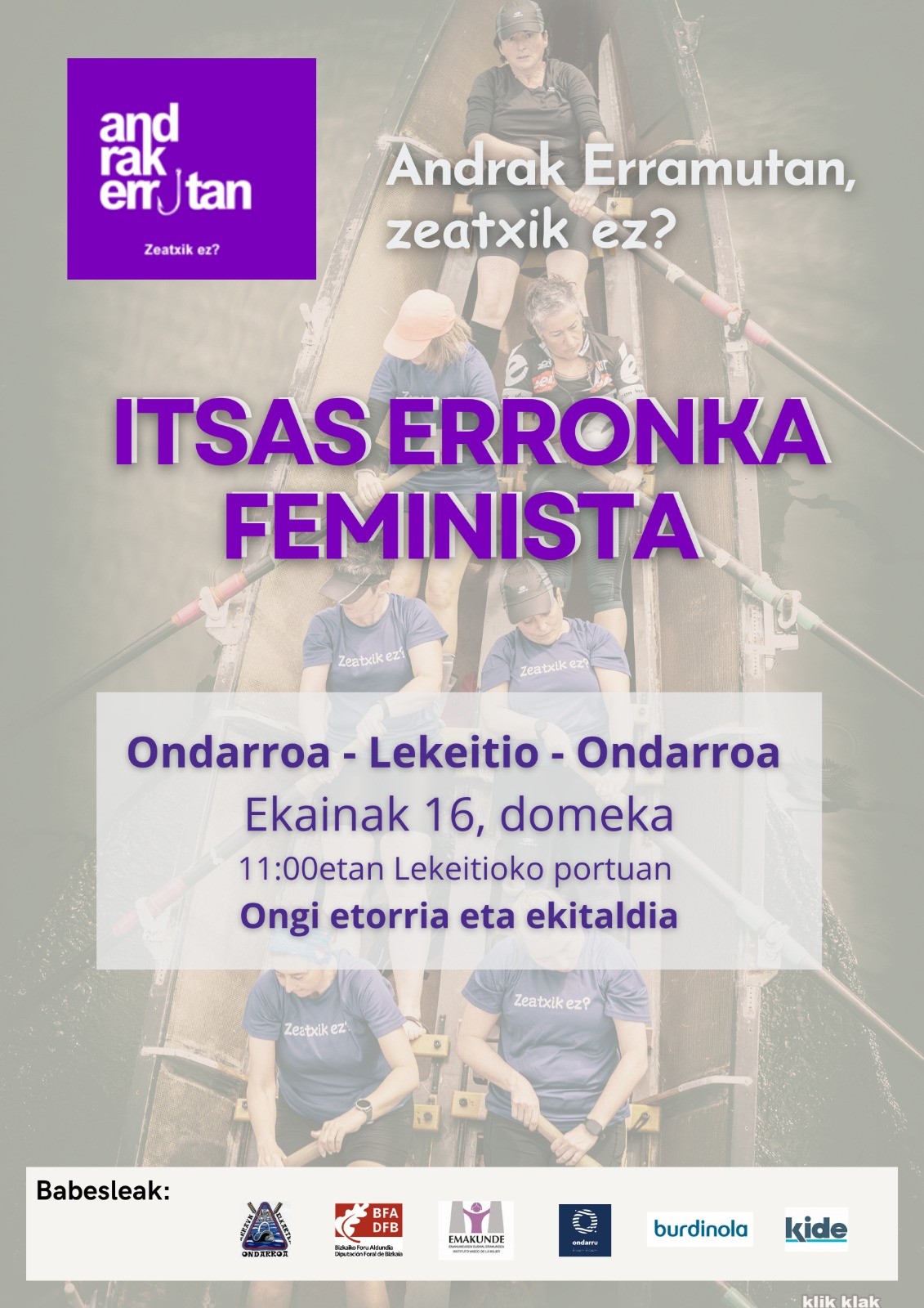 Galdera hau zabaldu dabe ekimen honetako partaidik: ANDRAK ERRAMUTAN ZEATXIK EZ?. Ta horreaz batea aurkeztu dabe ITXAS ERRONKA FEMINISTI. Ekainak 16 xan ONDARROA-LEKEITIO-ONDARROA arrunketi eingo dabe. Goxeko 11 etan ongi etorrixe eta ekitaldixe eongo da Lekeitioko portun. Guazen babesa emotea!