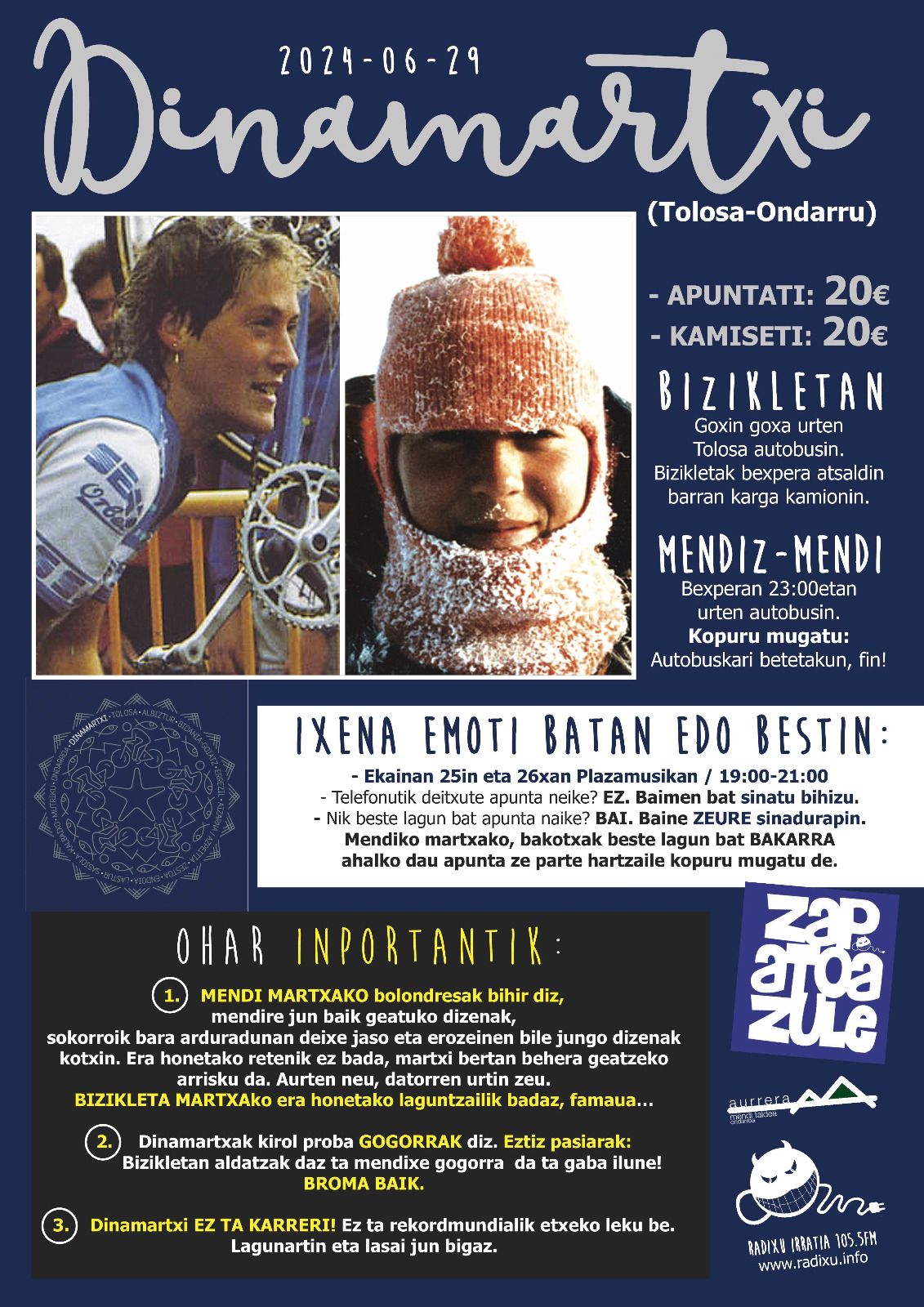 Jaso dou aurtengo DINAMARTXAko kartela. Bertan azaltzen da martxa horreta juteko bete birdizen baldintzak. Nun eta noiz emon birdizen ixenak, zemat diro ordaindu birdan, bizikletan duzenak noa erun birdaben bizikletak, baimenak siñatu beharrak…Antolakuntzatik bolondresak eskatzen jarraitzen dabe gauzak ondo eruteko (ez bazuz zuzenin parte hartzea, guardixan egoteko jenti eskatzen dabe edozer gertaeran aurrin esko bat botateko). DINAMARTXI gozateko ekimen bat ixaten da, prestatu beharra derrigorrezku dala diñue antolatzallik.