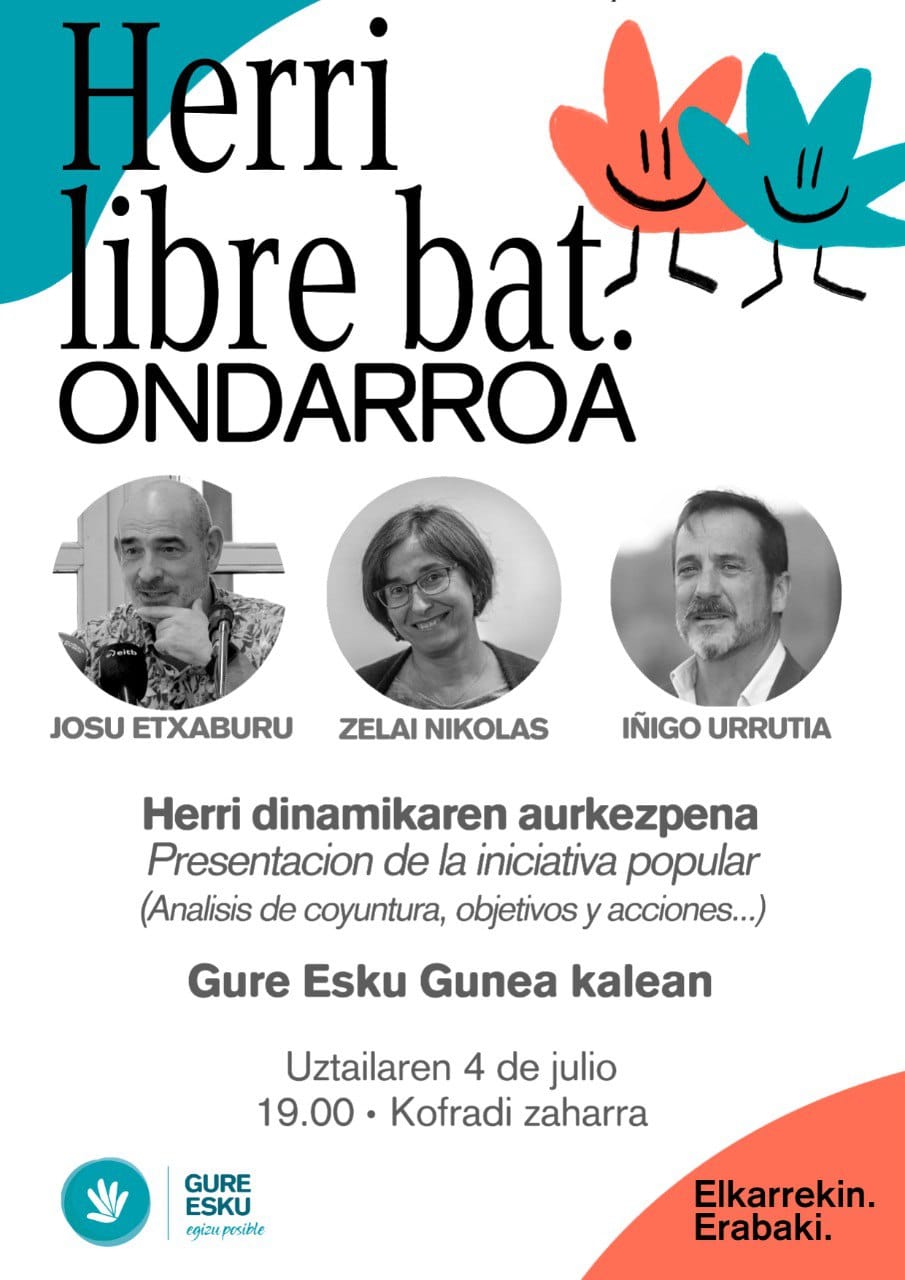 Datorren eguenin (U-4) HERRI LIBRE BAT! dinamiki aurkeztuko da Kofrai Zaharrin arratsaldeko 7retan GURE ESKUn antolakundin ahotsetatik. Hizlari lez JOSU ETXABURU OSA, ZELAI NIKOLAS EZKURDIA eta IÑIGO URRUTIA LIBARONA eukikouz. Hurreatu entzutea ekimen barri honen nundik noakuk!