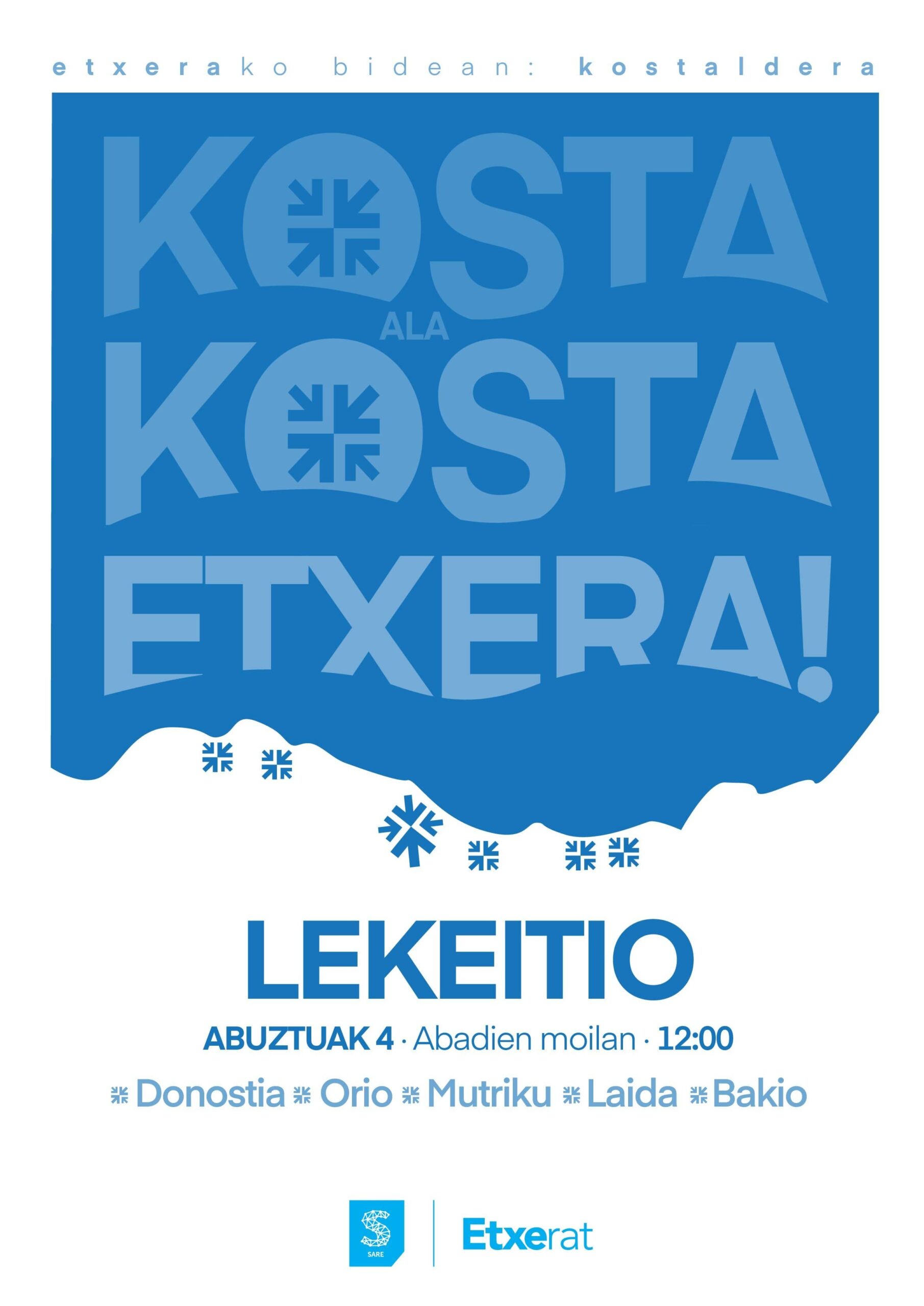 Beste urte batez, urtero ein douen latxeik hondartzetako mobilizaziñoik eingouz Abuztuak 4an (domeki) eguerdiko 12:00 xetan. Bañe ongun, Hego Euskal Herriko 6 hondartzetan alkartuko gaz, Bizkaiako hiru hondartzetan eta Gipuzkoako beste hirutan. Bakio, Laida, Lekeitio, Mutriku, Orio eta Donostiako hondartzetan hain zuzen. Lehenengo aldiz, urtero Etxeratek antolatu ixan daben hondartzetako mobilizaziñoi Sare Herritarraz batea antolatuko dabe. Elkarlanin, guztion arduri dalako euskal preso, iheslari eta deportatuen etxeratze prozesu gauzatzeko lanin jarduti.