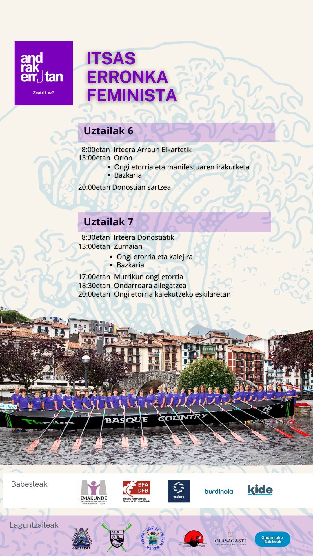 Zeñek pentsakoban hasiera baten onarte allako zile andrak erramutan ekimenan partaidik? Kostantzixi, burugogortasune, giro jatorra… danak bat ein eta erronkiai aurrea etxi lortu dabe. On azkan txanpan sartu diz eta ikasturtiai amaieri emoteko bi eguneko egitarau antolatu dabe. Uztailak 6 eta 7xan ONDARRU-DONOSTI eta DONOSTI-ONDARRU jun etorrixe erramutan eingo dabe. Tartin geldialdixak eingotxue bai ORIXO eta batxe be ZUMAXAN ta MUTRIKUn. Dana ezta ixango iserdixe atati eta bazkaxak, manifestu irakurketak eta kalejiri be uztartuko dabe. Ongi etorrixe be emon bikotzau ezta? Guk bai, behintzat!