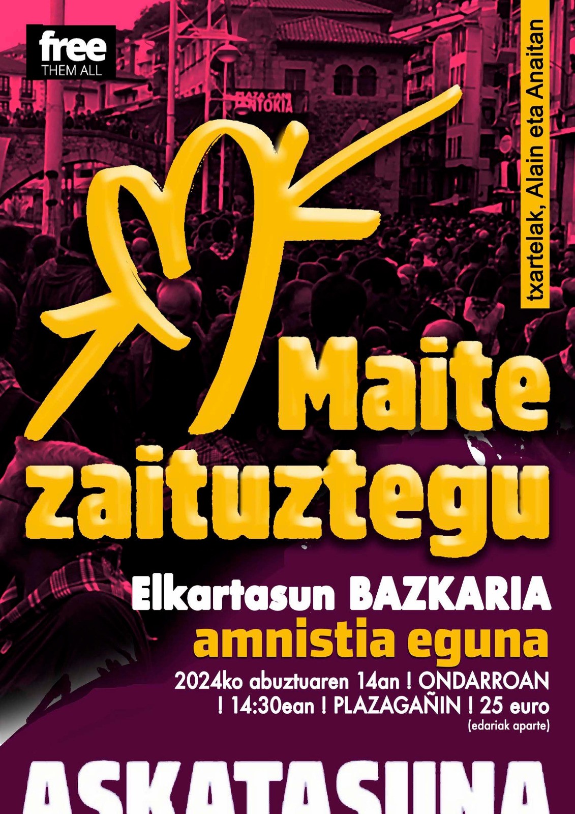 Abuztuak 14an ospatzen dou urtitan AMNISTIA egune herrixan ta aurten be gitxia ez da ixango. Egitaraun barrun bazkaxe etxen dou Plazagañin (400 lagunetik gora batzen gaz urtero) ta bertan parte hartzeko txartelak eskuratu birdiz edo ALAI edo ANAITASUNA tabernetan 25 euron trukin. Baakixue atzana popa ustel, eskuratu lelengotik! FREE THEM ALL! DANAK ETXIN ETA ASKE!