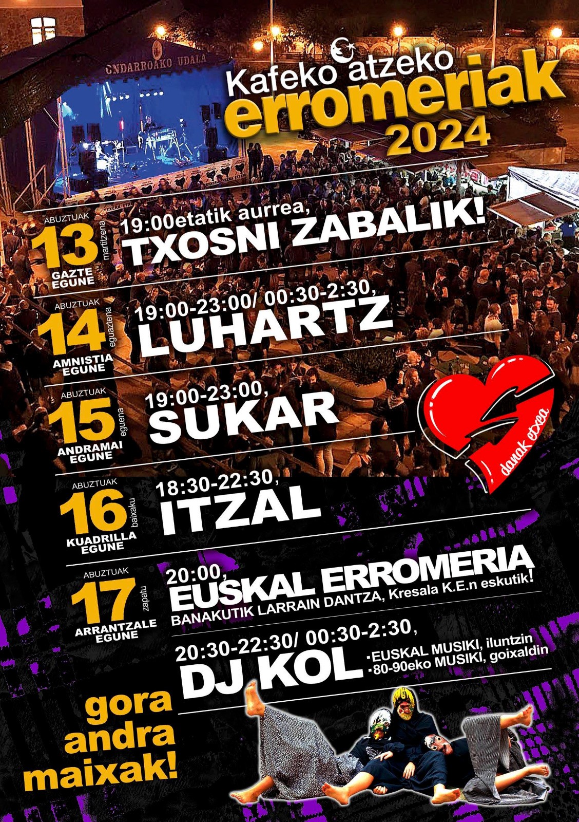Kafeko atzin jaxetan egongo dan txosnik (PRESO ta IHESLAXAN aldeku) bertan eingo dizen erromeixan egitarau zabaldu dau, bai egunak eta batxe be ordukin. DANAK ETXIN ikusi arte jo ta ke!
