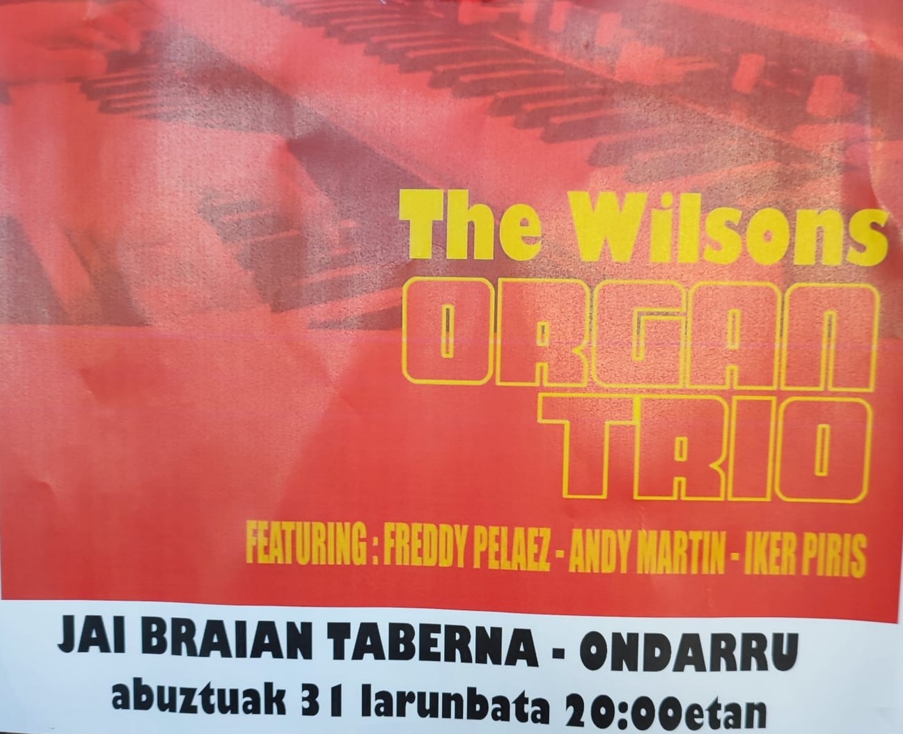 Gaur illuntzeko 8retatik aurrea The Wilsons organ trio hirukoti (FREDDY PELAEZ, ANDY MARTIN eta IKER PIRIS) eukikou Jai Braianen! Hurreatu eta gozatu doinu desbardiñakin!