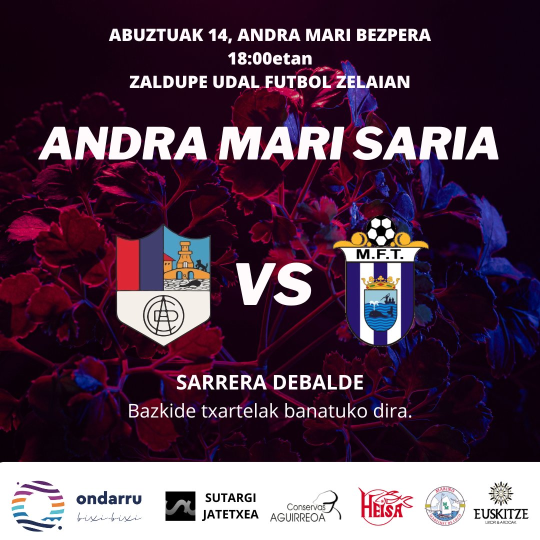 Abuztuan 14an, eguaztena, urteroko Andra Mari futbol sarixe jokatuko da Zaldupen, AURRERA K.E.- MUTRIKU F.T taldin artin arratsaldeko 18:00etan. Sarreri debalde ixango da eta 5:30xetatik aurrea AURRERA K.E. bazkide txartelak banatuko diz bertan. Aupa AURRERA tra ka tra!
