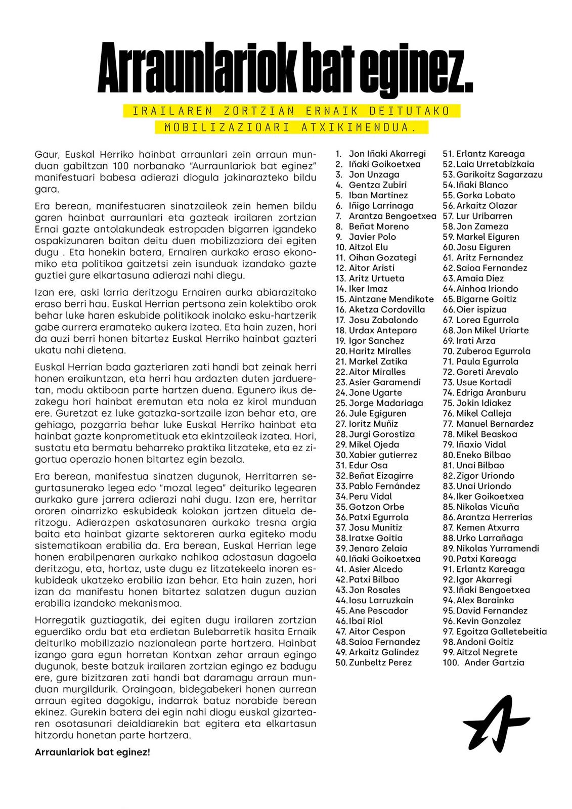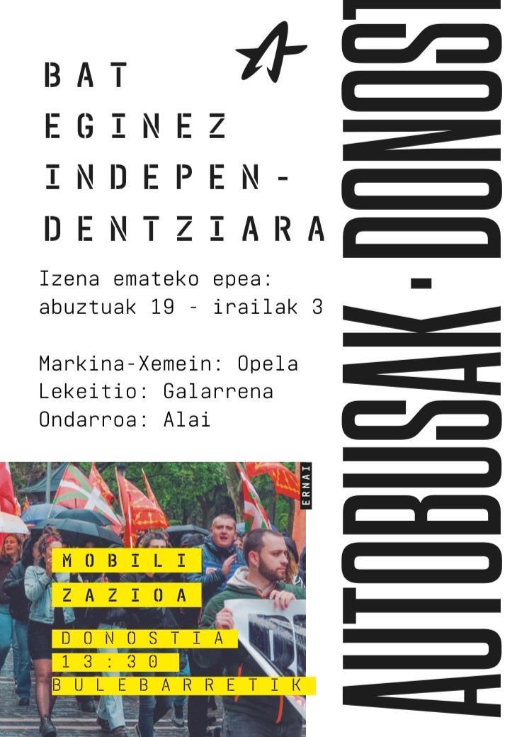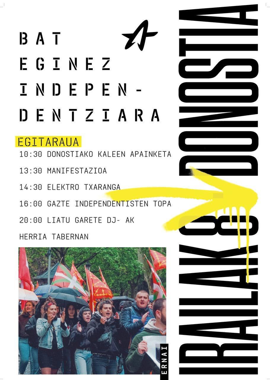Irailak 8an (Kontxako domeki) manifa nazionala deitxu dau ERNAI gazte antolakundik “Bat eginez, INDEPENDENTZIARA” lemapin. Manifiaz gain egun osoko egitarau antolatu dabe gaztik.
