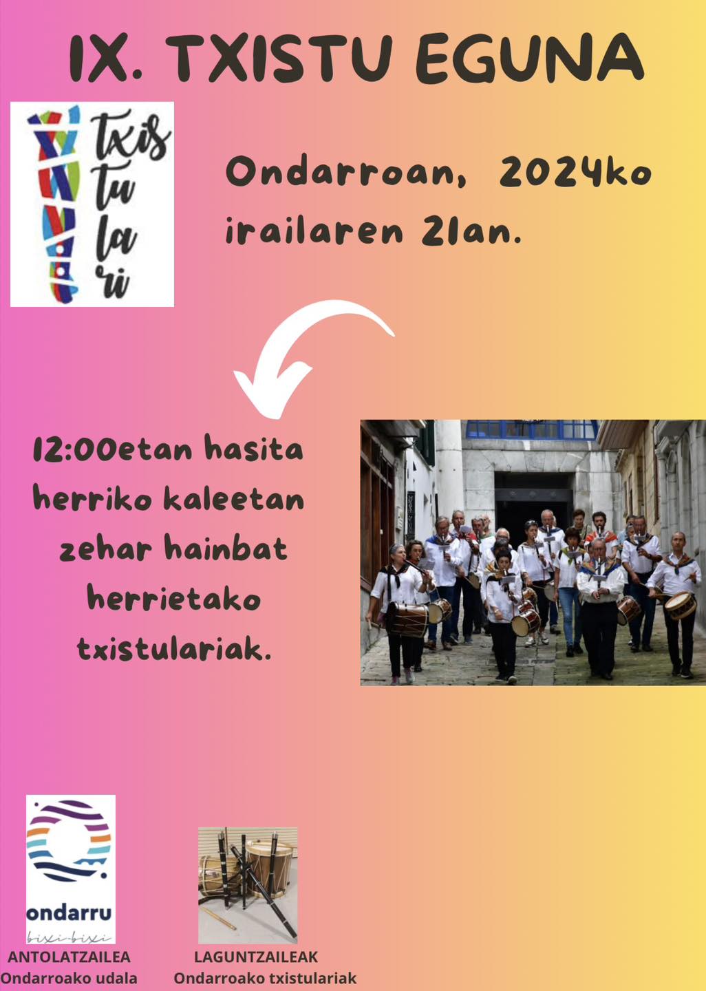 Ongo zapatun, irailak 21, txistu doinuk entzun ahal ixango douz herriko kalitan 12:00etatik aurrea, bederatzigarren Txistu Egunaren barrun.