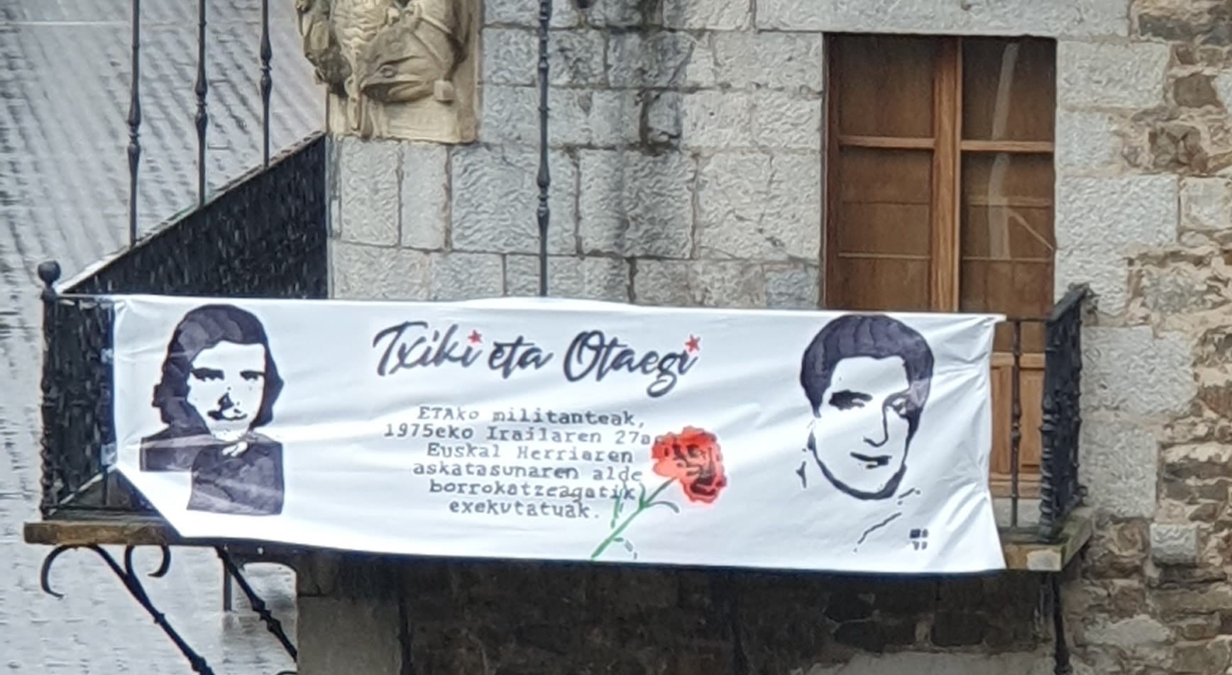 Txiki eta Otaegi oroitzen daben pankarta hau da ipinitxe Kofrai Zaharreko balkoin: