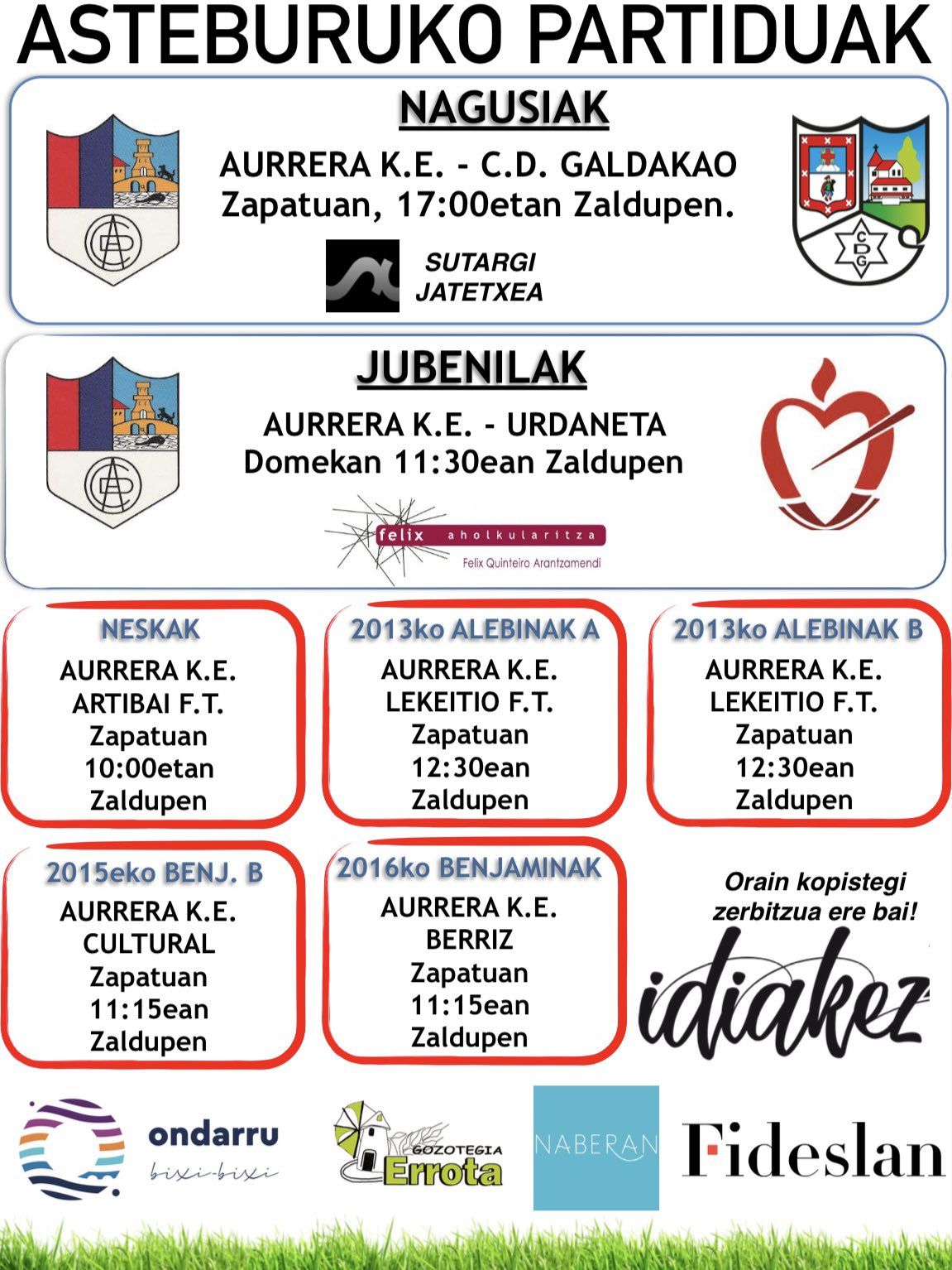 Honek diz astebukaera honetan AURRERA K.E. futbol talde desbardiñak Zaldupe udal futbol zelaxan jokatuko dotxuen partidun egun eta ordutegixak. Aupa Aurrera tra ka tra!