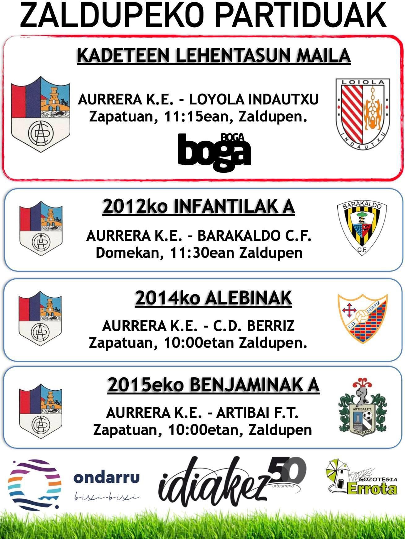 Honek diz astebukaera honetan Aurrerako talde desbardiñak Zaldupe udal futbol zelaxan jokatuko dotxuen partidun egun eta ordutegixak. Aupa AURRERA!