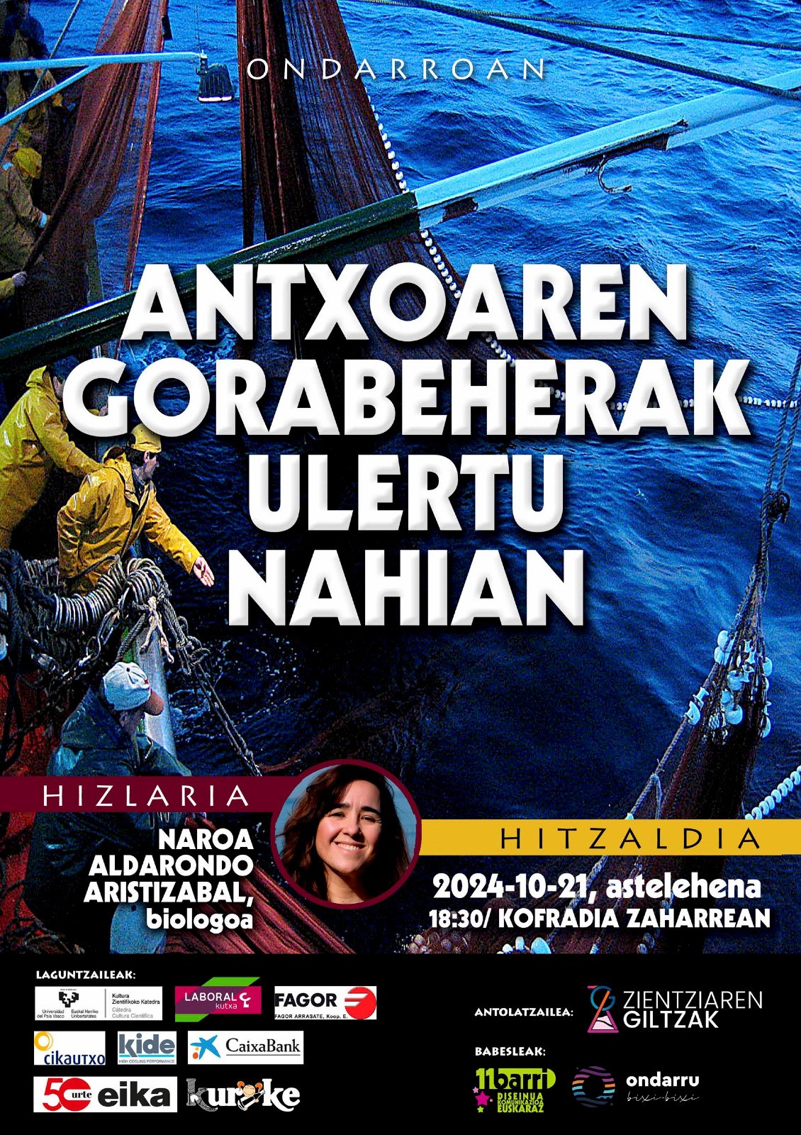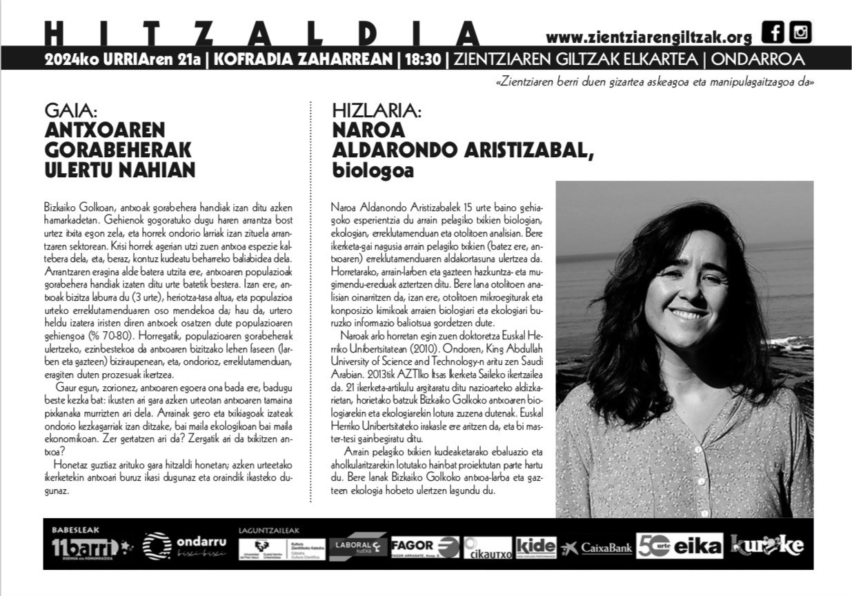 Zientziaren Giltzak Elkarteko Urriko hitzaldixak bertatik berta ikutzen gatxu, ANTXOAREN GORABEHERAK ULERTU NAHIXAN ixenburuk dana esaten dosku. Hizlari lez, NAROA ALDARONDO ARISTIZABAL biologu eukikou. Gogoratu, datorren astelehenin urriak 21 arratsaldeko 6:30xetan Kofrai Zaharrin. Gai interesanti ta hurreku, etorri entzutea!