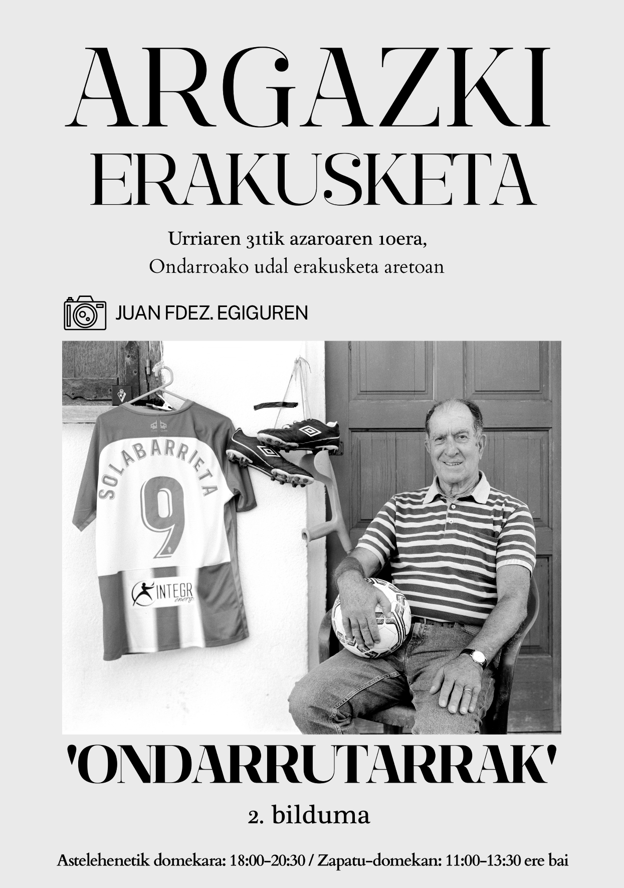 Juan Fernandez Egiguren argazkilaxak ๐๐ง๐๐๐ซ๐ซ๐ฎ๐ญ๐๐ซ๐ซ๐๐ค erakusketin 2.bildumi dakar Udal Erakusketa areture, Urrixan 31tik azarun 10earte. Hau de erakusketako ordutegixe: astelehenetik domeka, 18:00etatik 20:30eta. Zapatun eta domekan, 11:00etatik 13:30eta be bai.