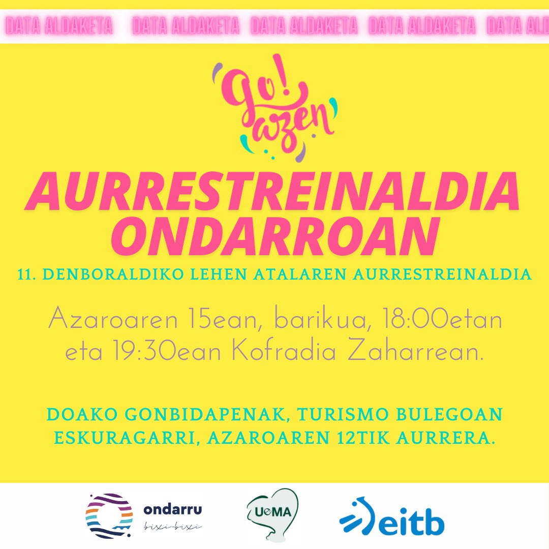 11. denboraldiko GOAZEN!en aurreestreñaldixe aurketuko dabe Azarun 15in (baixaku) arratsaldeko 6etan eta 7:30xetan Kofrai Zaharrin. Sarrerak (doan), Turismo Bulegun jaso beharko diz azarun 12tik aurrea. Pertsonako, gehienez, lau sarrera ahalko dabe eskuratu.