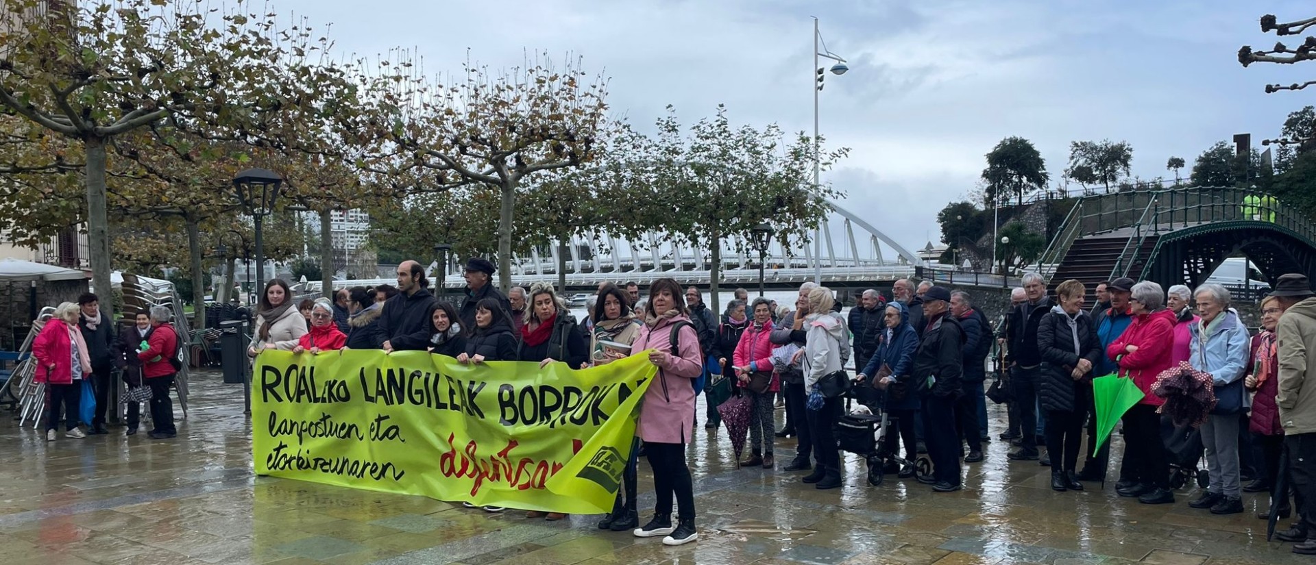 Pentsionistan elkarretaratzi amaitxu danin ROALeko bihargiñak euren aldarrikapenan aldeko enkarteladi egin dabe, hainbat pentsionista lagun dotxuezela.