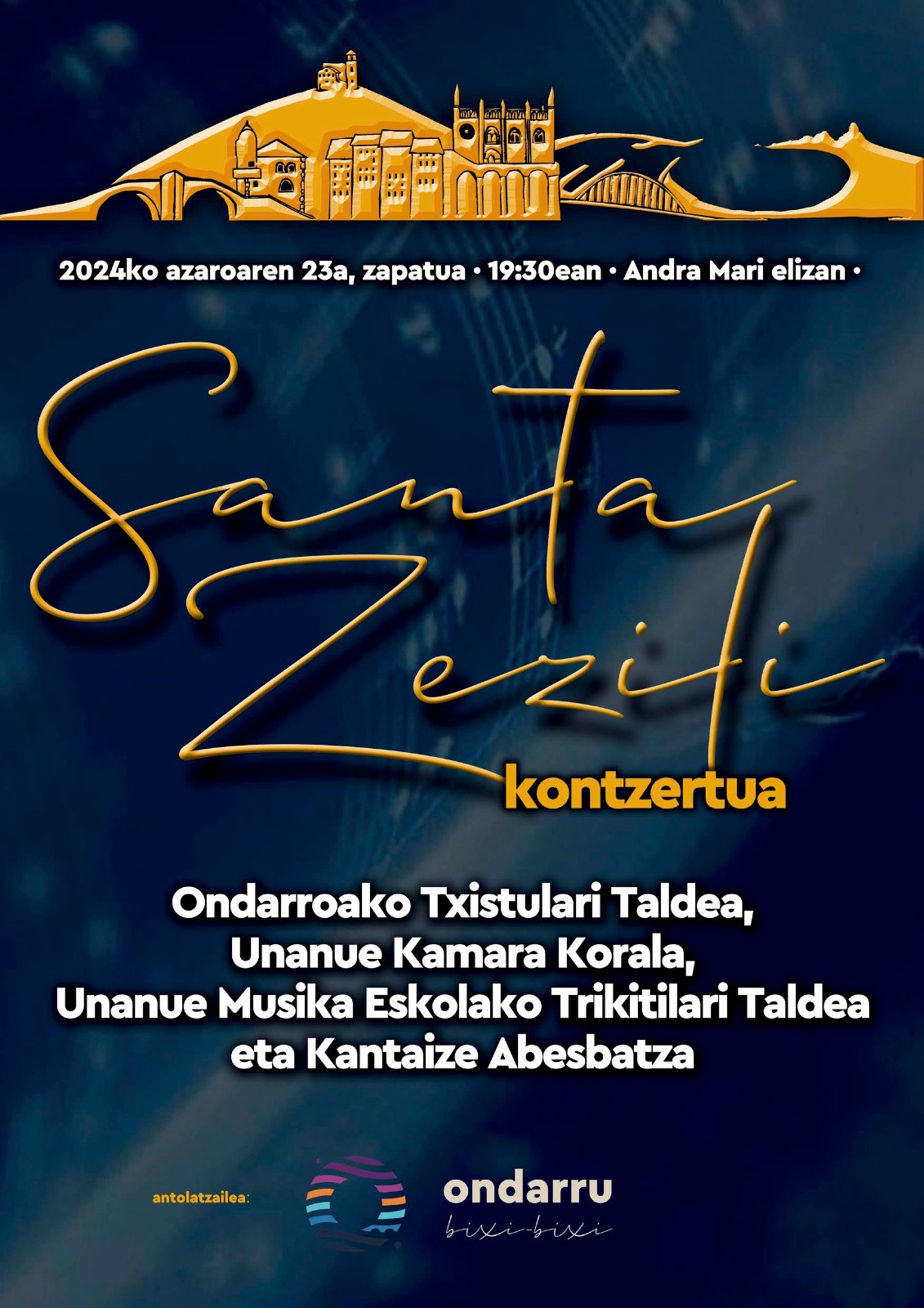 Musikaxan egune ospatzeko (Santa zezili) kontzertu antolatu dabe ongo zapaturako (A-23) Andra Mari elixan arratsaldeko 7:30xetan. Parte hartzallik: Herriko txistulai taldi, Unanue kamara korala, Unanue musika eskolako trikitrilai taldi eta Kantaize abesbatza. Anima eta gozatu belarrixak.
