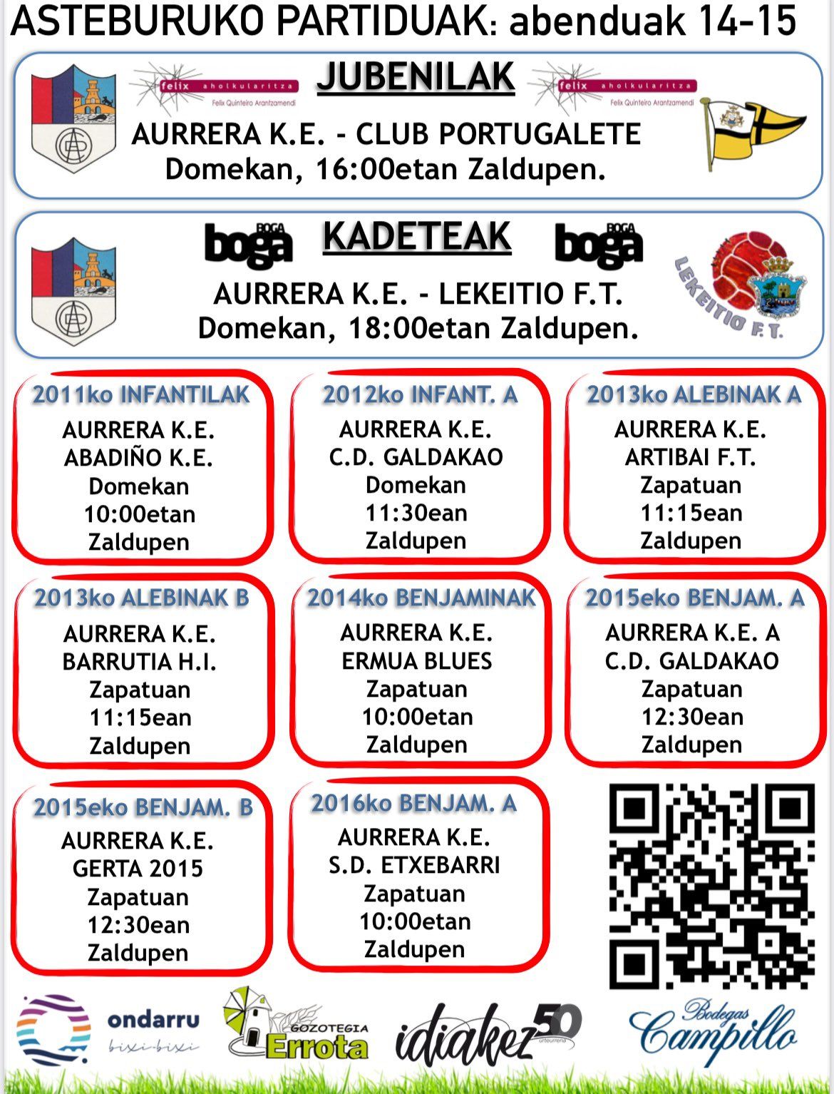 Azpixan dakazuez Aurrerako futbol talde desbardiñak ongo astebukaeran jokatukotxuen partidun egun eta ordutegixak Zaldupe udal futbol zelaxan.