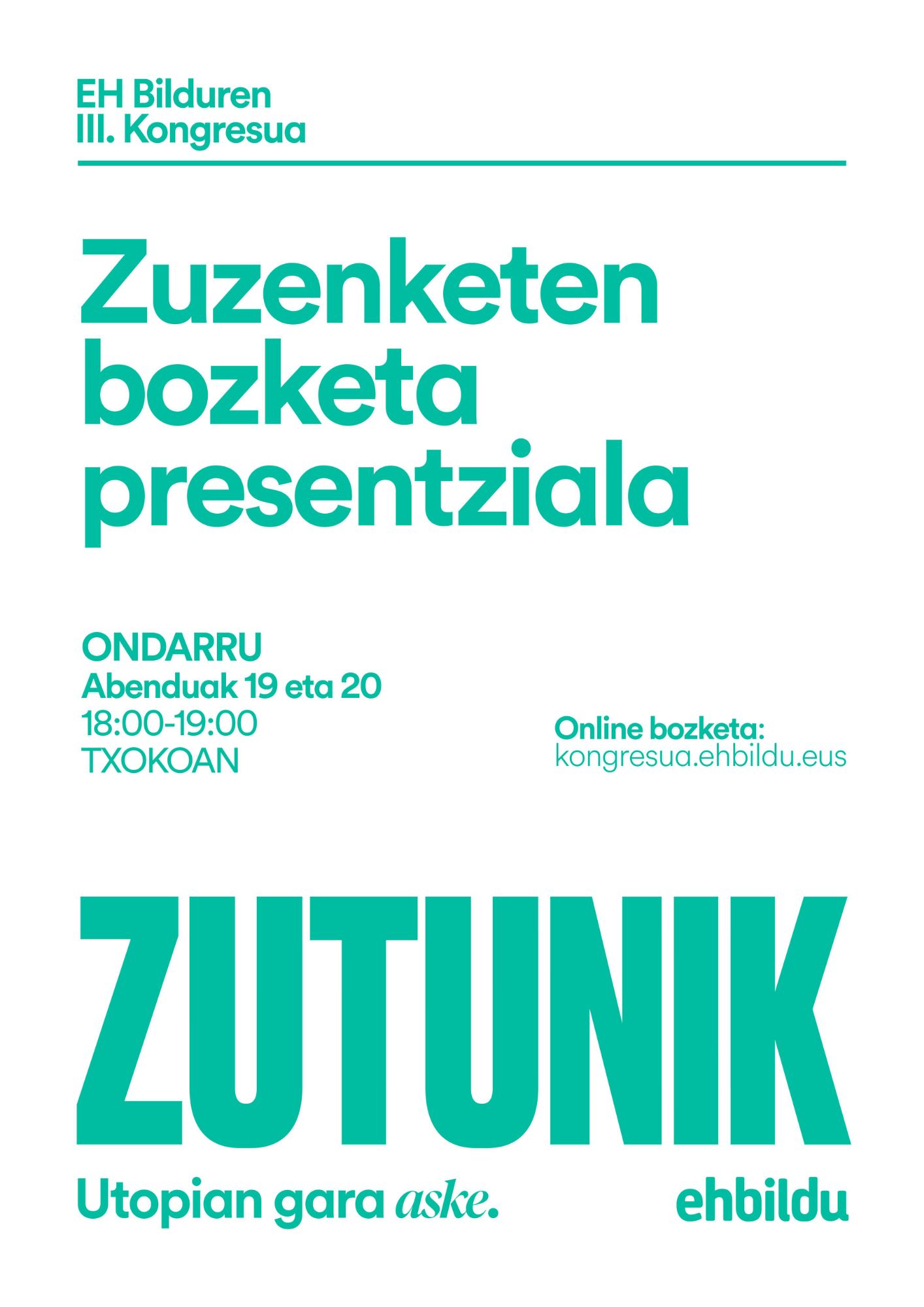 Aurrea du EH Bilduko 3. kongresu eta bozketan sasoi hasi de. Hasteko, ZUTUNIK borradorai eingakoen emendakiñan zuzenketan bozketak ahalko diz ein bai telematikoki bai presentzialki. Abendun 19 eta 20xan arratsaldeko 6 tatik 7 rak bittartin eukiko Ondarrutarrok etxeko aukeri Txokun.