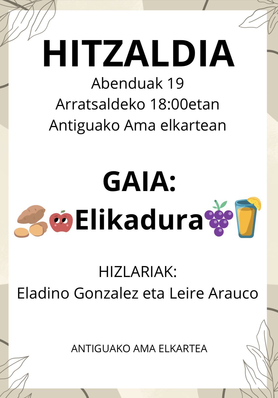 Antiguako Ama elkartik elikaduriai buruzko hitzaldixe antolatu dau gaurko (abenduak 19), arratsaldeko 18:00etan elkartin bertan. Hizlarixak: ELADINO GONZALEZ mediku eta LEIRE ARAUCO farmazialaixe eta nutrizionisti eongo diz.