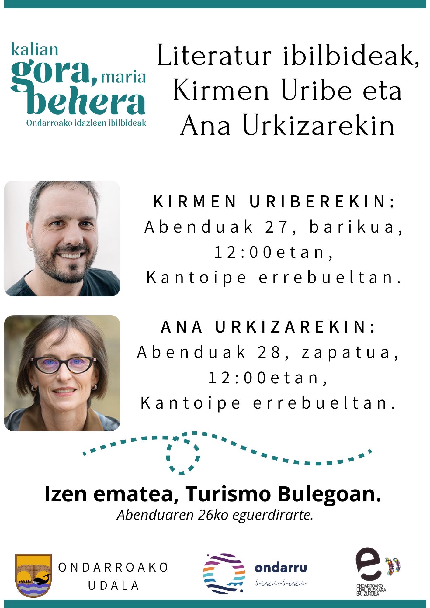 ‘Kalian gora, maria behera’ Literatur ibilbidik Kirmen Uribe eta Ana Urkizaz etxeko aukeri eongo da baixakun eta zapatun. Gogoratu ixena emon bihir dala Turismo Bulegun eguen eguerdixe baño lehen. Ez da leku askoik geratzen!