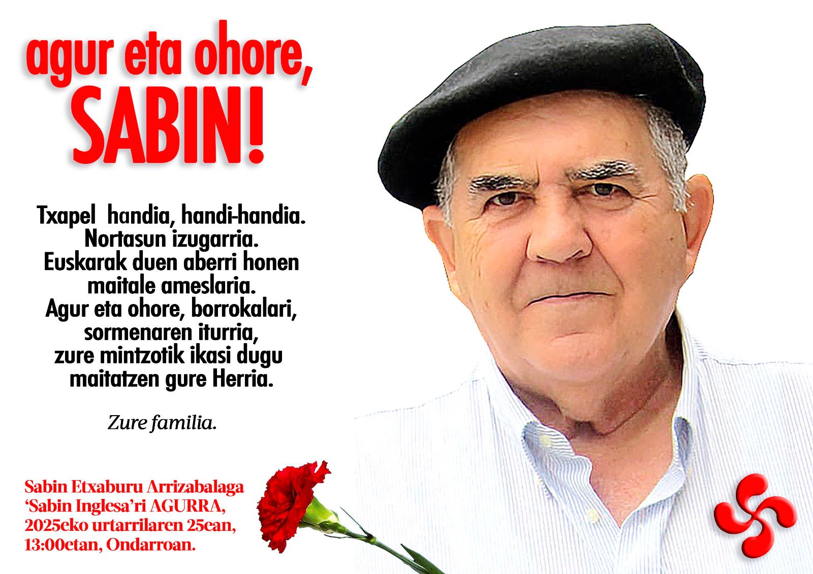 Urtarrilak 25 (ongoxe zapatun) eguerdiko ordu batetan, Arrain lonja barriko goiko plazan (eurixe eon ezkero aterpe txiki bat da bertan) emongo gako azken agurre Sabinei ekitaldi xume bateaz, beran nahixe kontutan eukitxe, Kantauri itsosuai begire. Betirarte SABIN!