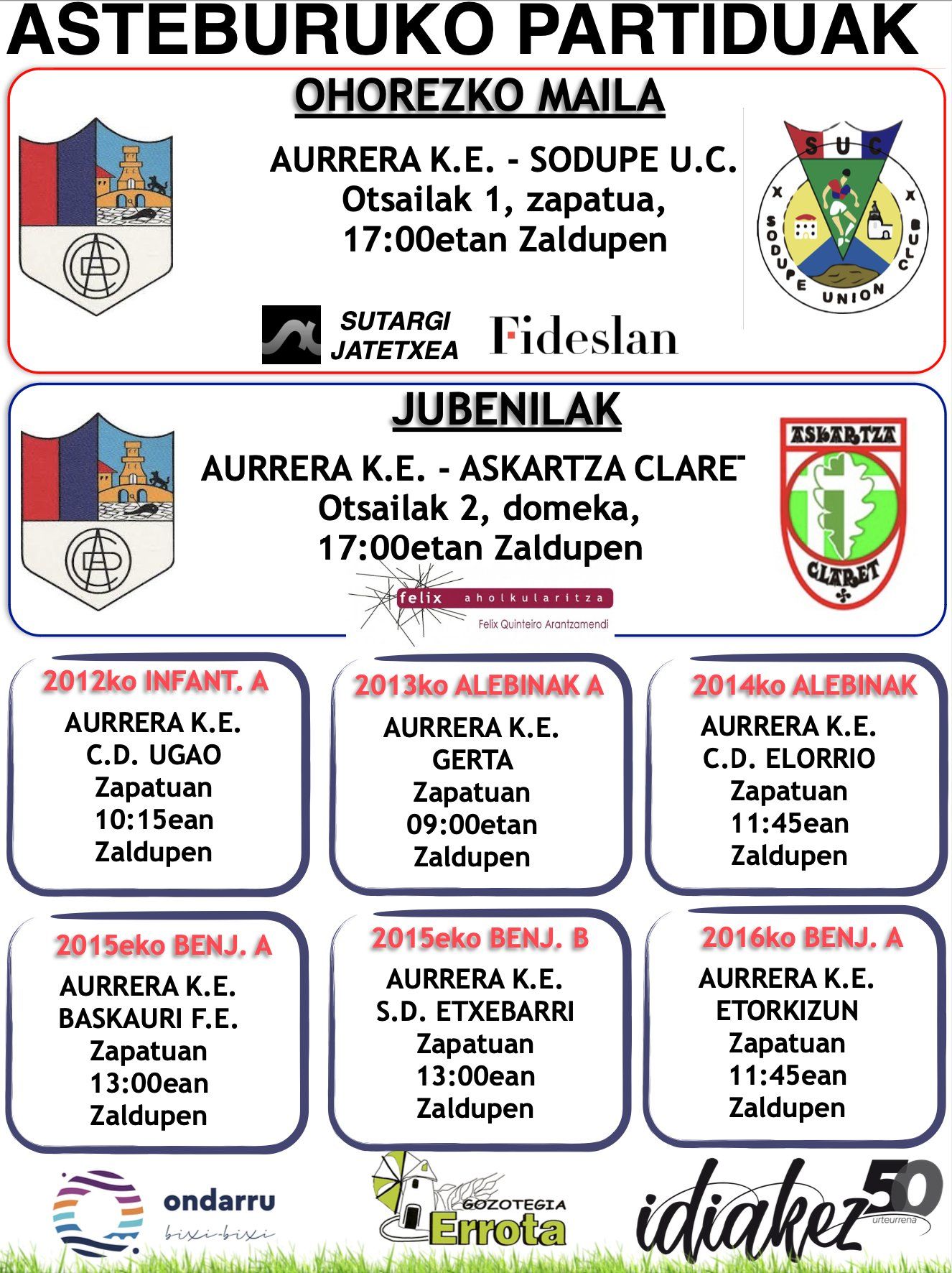 AURRERA K.E. futbol taldin astebukaerako partiduk! 2025/01/312025/01/30turrune Honek diz astebukaera honetan Aurrera futbol taldeko ekipo desbardiñak jokatukotxuen partiduk Zaldupe udal futbol zelaxan. Partekatu hau: Click to share on Facebook (Opens in new window) Facebook Click to share on X (Opens in new window) X Atsegin dut Kargatzen...