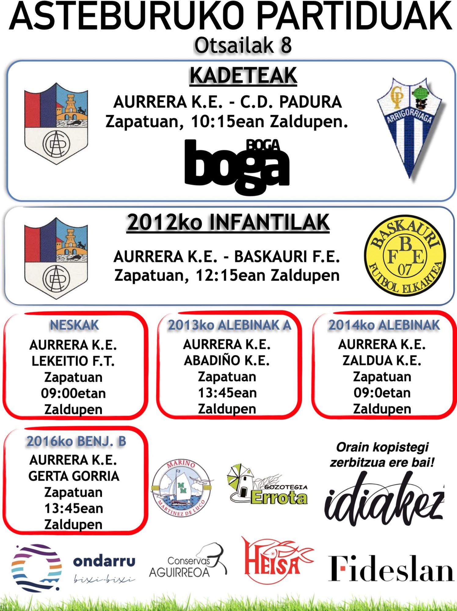 Aurrerak ohar bat altza dau sare sozialeta, esanaz, hasieran aurreikusitxako baño ordu laurden beranduaua hasiko dizela 2012B, 2013A eta 2016B taldin partiduk. Aupa AURRERA tra ka tra!