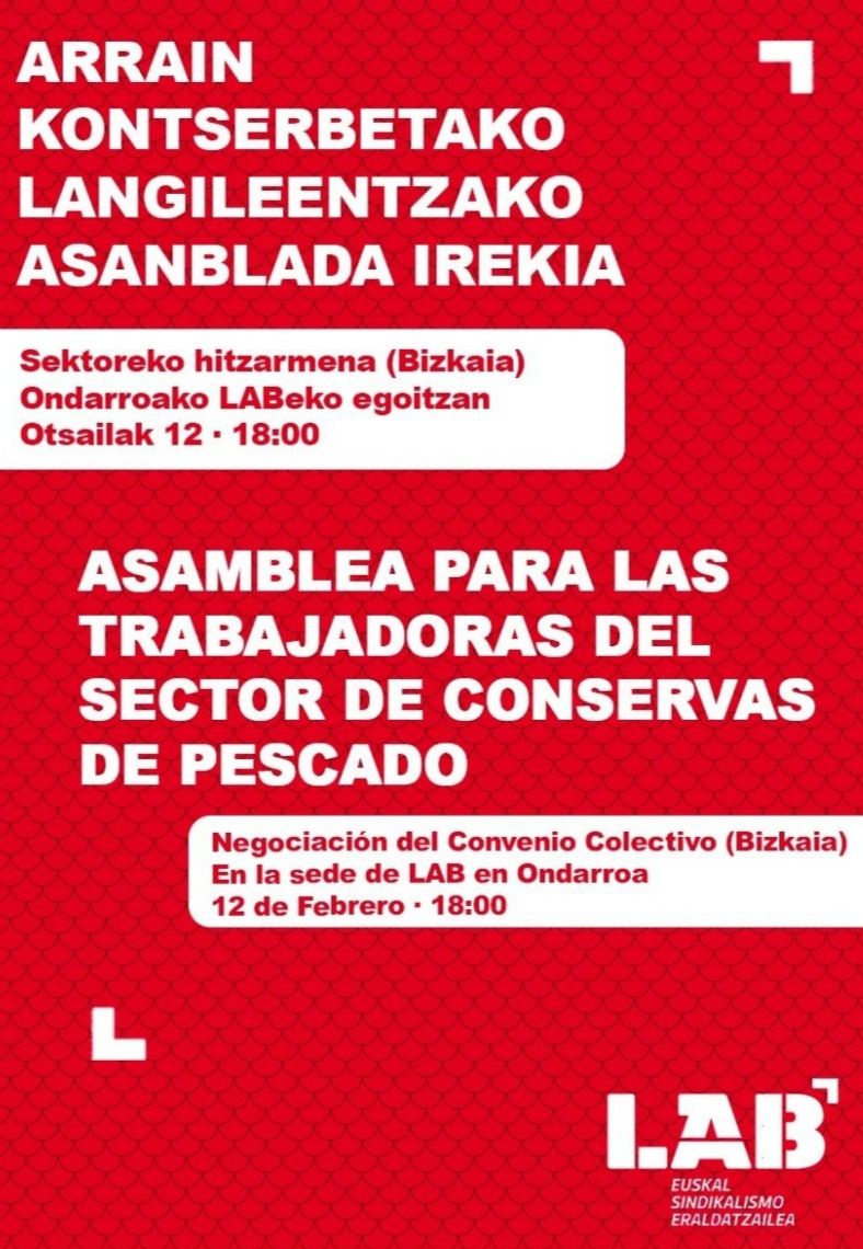 Lan hitzarmena barrizteko sasoi alla gakue arrain kontserbako langilliai ta horren barri emoteko billeri antolatu dabe Ondarrun otsailak 12 (eguaztena) L.A.B. sindikatuko egoitzan. Antolakuntziaz eta borroki eiñaz lortzen diz gauzak. Jo ta ke!
