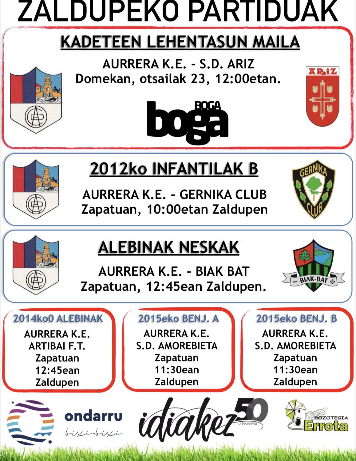Honek diz, astebukaera honetan Aurrerako futbol talde desbardiñak jokatukotxuen partiduk Zaldupe udal futbol zelaxan. Aupa AURRERA tra ka tra!
