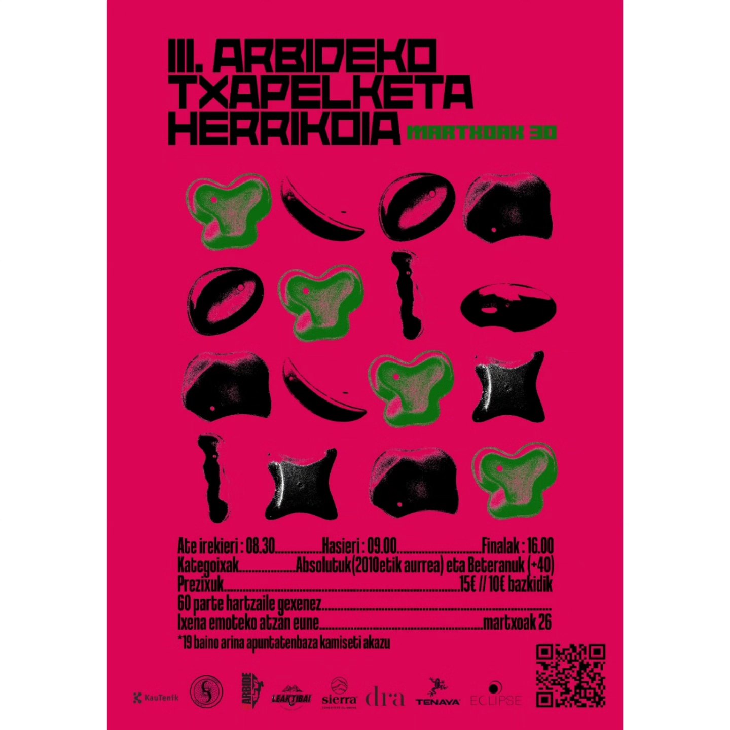 Martxoan 30 (domeki) jokatuko da Iñaki Deunan dan Arbideko rokodromun ARBIDEKO III. Bloke txapelketa Herrikoia!, Goxeko 9:00 tan (ate irekieri 8:30). 60 parte hartzaile gexenez, Ez eon zain atzan momenturate, Ixen emoti online: arbide.eus webgunetik edo QR kode bidez zuzenin. Ordainketi transferentzixa bidez eingora, 15euro (bazkidik 10 euro). Ixena emoteko azkan egune MARTXOAK 26. (Martxoak 19 baino berandua apunta ezkeo kamisetaik eztozu eukiko).