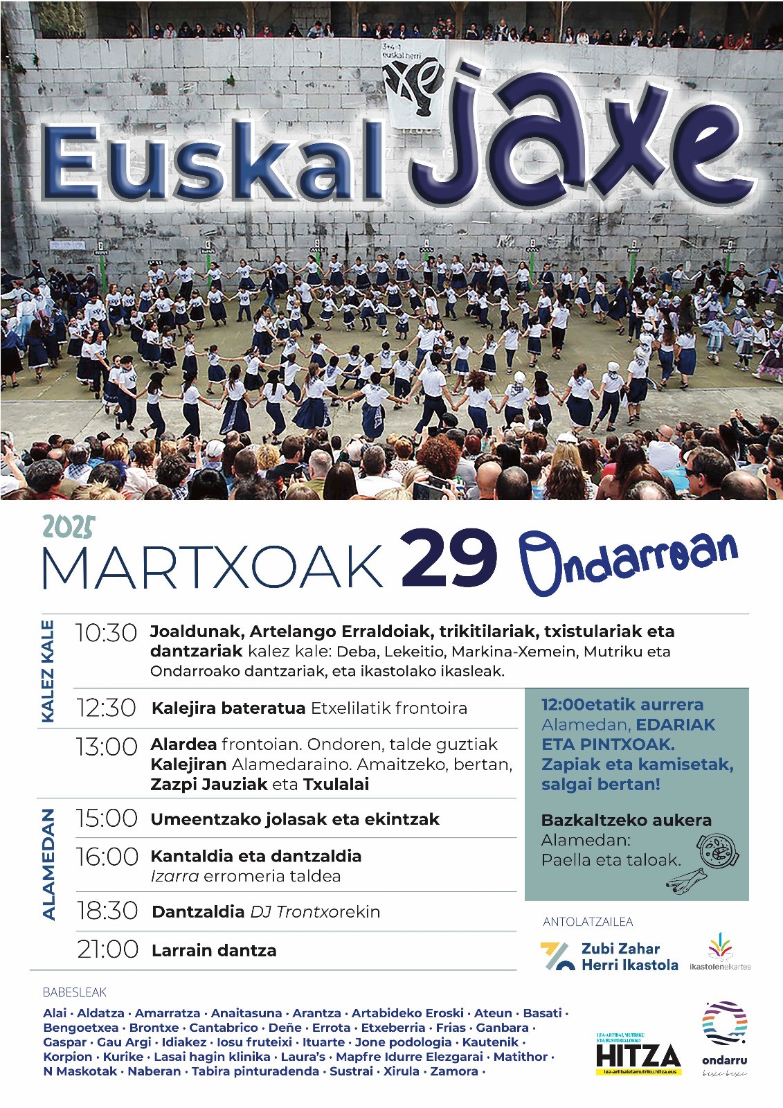 Egun guztiko egitarau antolatu dabe Martxoak 29rako (zapatu) EUSKAL JAXEn ixenburuaz. Goxin goxa kalez kale eta eguerditxik aurrea Alamedan, danetatik eukikou. Dantza saiuk, musikarixak, jolasak, erromeixi…ta jana eta edana ezta faltako. Batu giro ederrea! Azpixan dakazue egitarau.