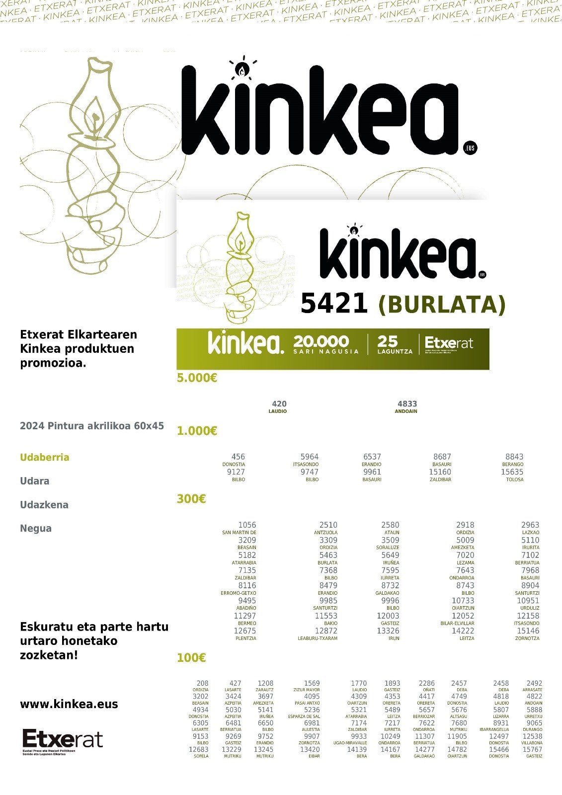 2025. urtin lau promoziñoi etxeko asmu dauke ETXERAT Elkartik (PRESO ta IHESLAXAN Senidin elkarti), eta KINKEA promoziñoi bakotxeko 20.000 artelan salduko diz. Aurtengo artelanak Ander Hormazuri artistik eginiko pintura akrilikuk diz. Lelengoko hiruhillabeteko zozketi eindde eta ongun herrixan be sos apurrak geatu diz (7.643, 7.622 eta 10.249 zenbakixak). Zoixonak irabazliai. DANAK ETXEA EKARRI ARTE JO TA KE!