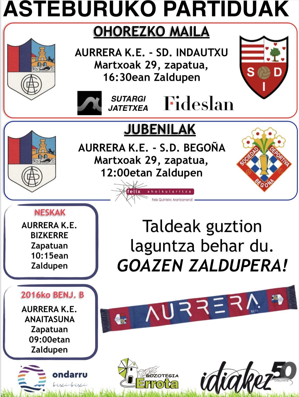 Azpixan ikusiko dozuenak diz astebukaera honetan Zaldupe udal futbol zelaxan Aurrerako futbol talde desbardinak jokatukotxuen partidun egun eta ordutegixak. Aupa AURRERA tra ka tra.