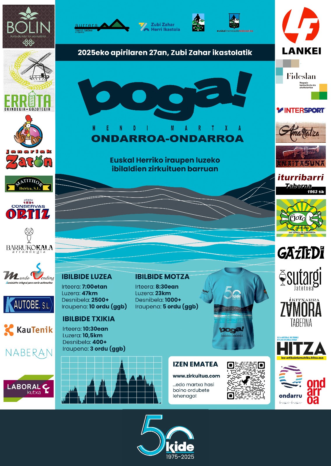 BOGA mendi martxi, Ondarruko Zubi Zahar herri Ikastolik (Aurrera Mendi Taldin laguntziaz) antolatutako mendi irteeri de. Berau, Apirilaren 27xan ixango da eta hiru ibilbide desberdin eukikotxu adin zein forma fisiko desberdinak dauken jendik parte hartu dezan.