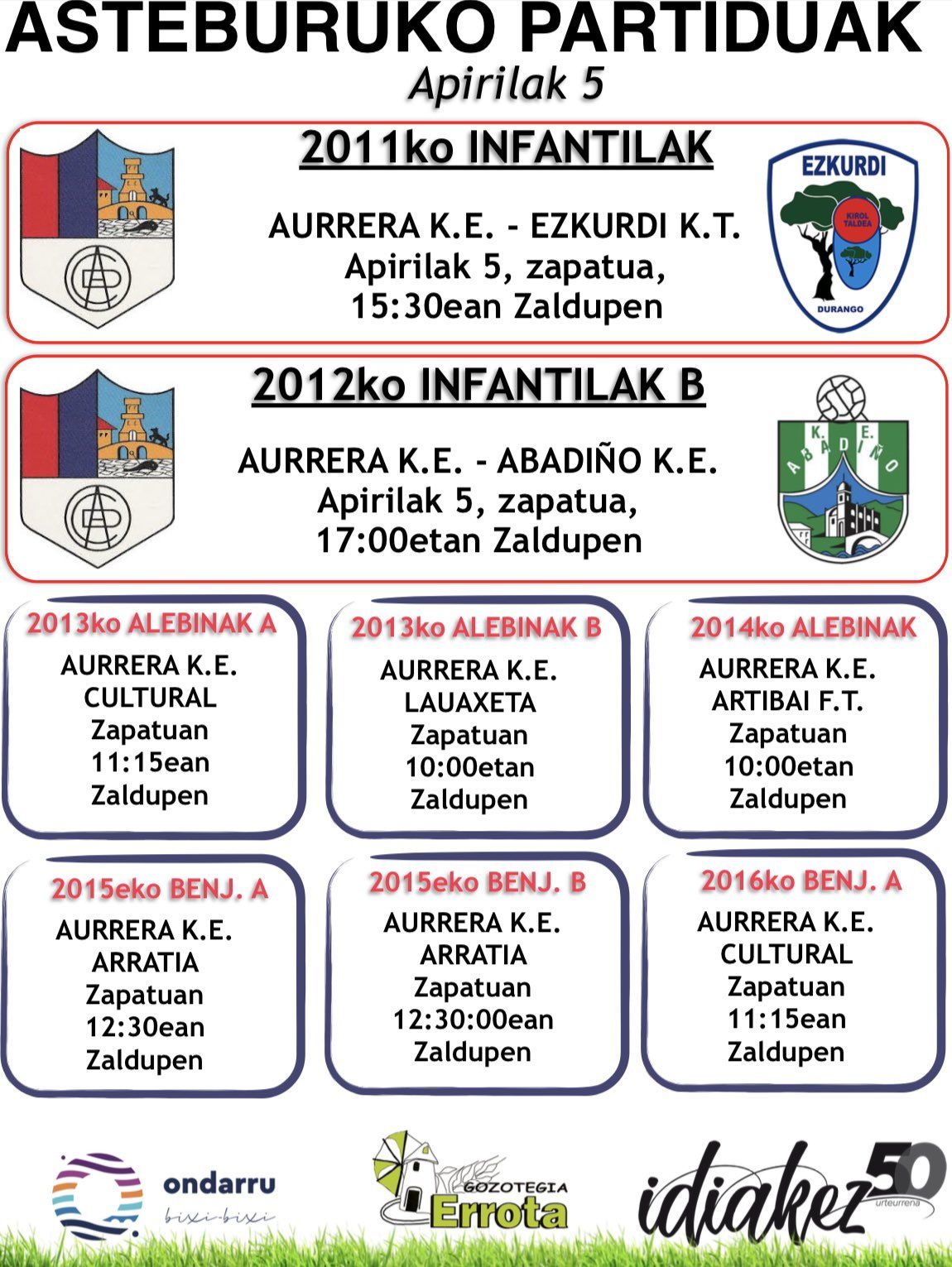 Honek diz astebukaera honetan AURRERAko futbol talde desbardiñak jokatukotxuen partiduk Zaldupe udal futbol zelaxan, egun eta ordutegixak. Aupa AURRERA tra ka tra!