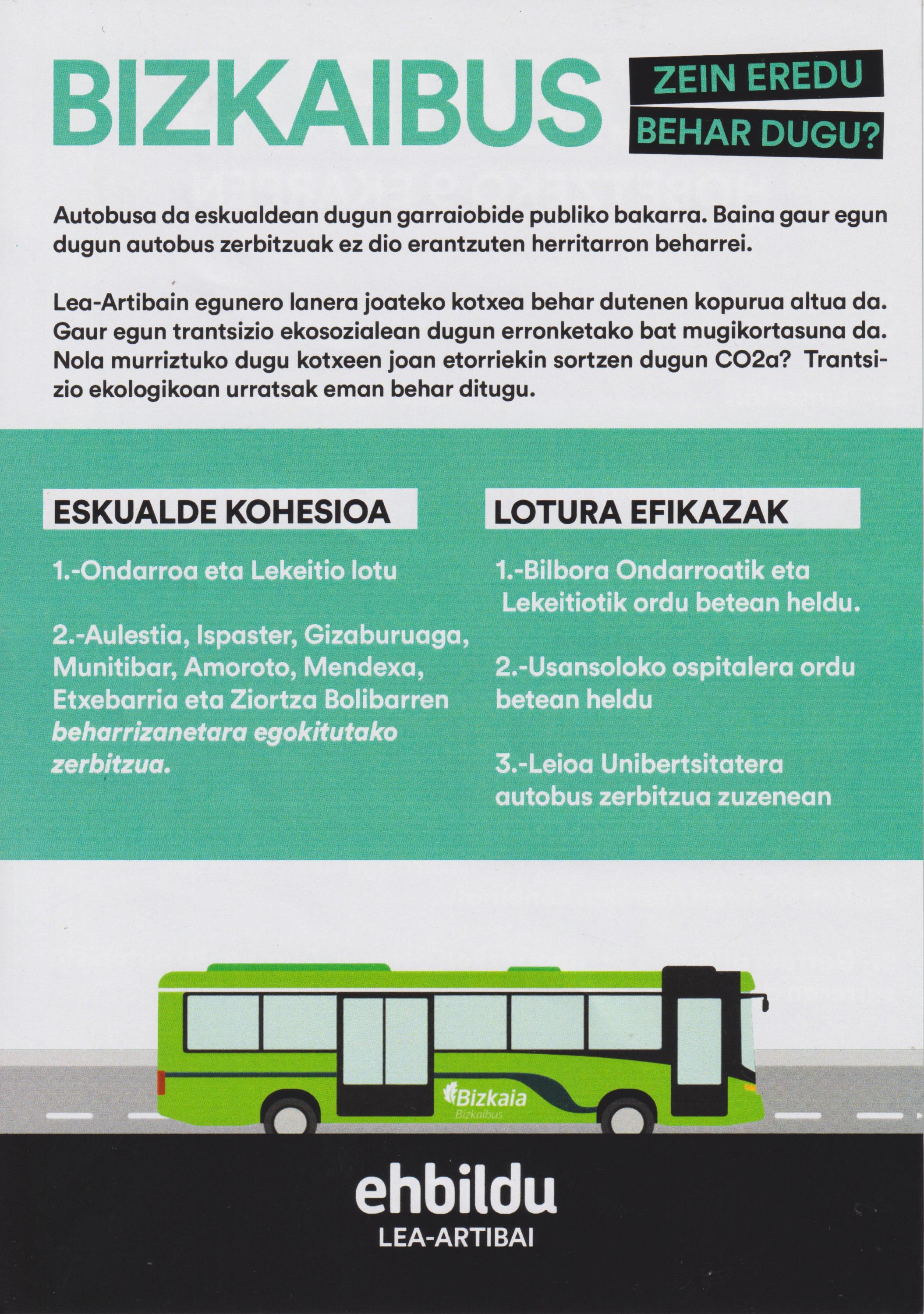 LEA-ARTIBAIko EH Bilduk proposamen zehatzak kaleratutxu eskualdeko garraio publiku hobetzeko. Azpixan ikusiko dozuen latxeik 9 ekarpen aurkeztutxu. Ondarrutarroi dagokigunez, Galdakaoko ospitxalea juteko linea zuzena eskatzen da adibidez edo Leioako Unibertsitatea juteko be zerbitzu zuzena beste gauza batzun artin. Eztou merezi ala zerbitzu hobiauak nahiz eta Bizkaiko atzanengoko herrixe ixan? Geu be Bizkatxarrak gaz!
