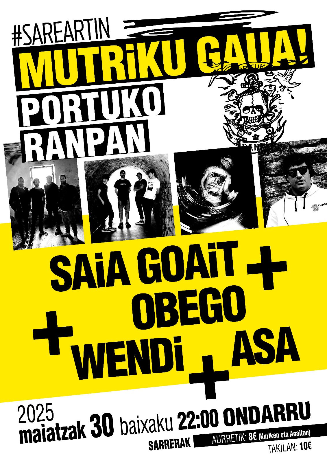 Mutrikuarrak jaun da jabe eingo diz Maxatzan 30in (baixaku) Portuko Ranpan Sareartin kontzertutan barrun. Gabeko 10etan hasi eta luze jungo dan gabaz talde honek hartuko dabe parte: SAIA GOAIT+ OBEGO+ WENDI+ ASA. Sarrerak salgai daz dagoeneko KURIKE dendan eta ANAITASUNA tabernan 8 euron trukin edo egun berin takillan 10 eurotan. Amillu, txerkei, aura….gozatu aldameneko soñukin!