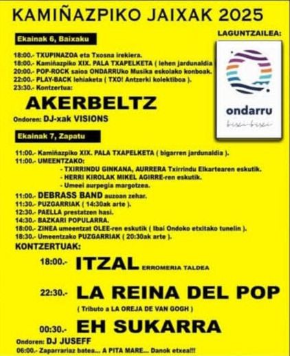 Ekainak 6 eta 7 xan ospatukou Kamiñazpiko jaxak, hamen dakazue aurtengo egitarau, beti lez bete beti. Danetik eukikou: Zelan ez Play-Baka, pala txapelketi, kontzertuk, jolasak, zini, paelladi…eztabenak nahi ondo pasa dule etxea, bestiok gozatzea. Gora KAMIÑAZPI!