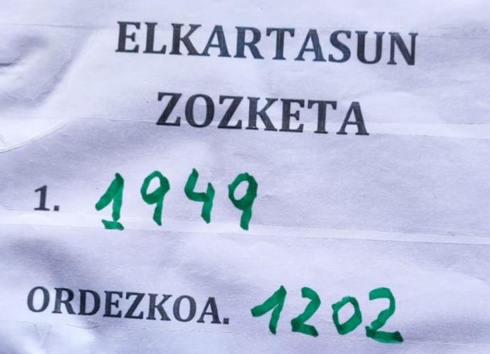 Gaur goxetik egon diz kalekutzeko eskillaretan ELKARTASUNEzko otzarin zozketako billetik saltzen. Helburu, herrixan falta douzenai laguntza ekonomiku emoti. Azpixan ikusiko dozuen zenbakixe ixan da irabazli eta ez balitxake agertuko, ordezkuk erungo dau otzari. Zoixonak irabazliai eta gozatu otzariaz.