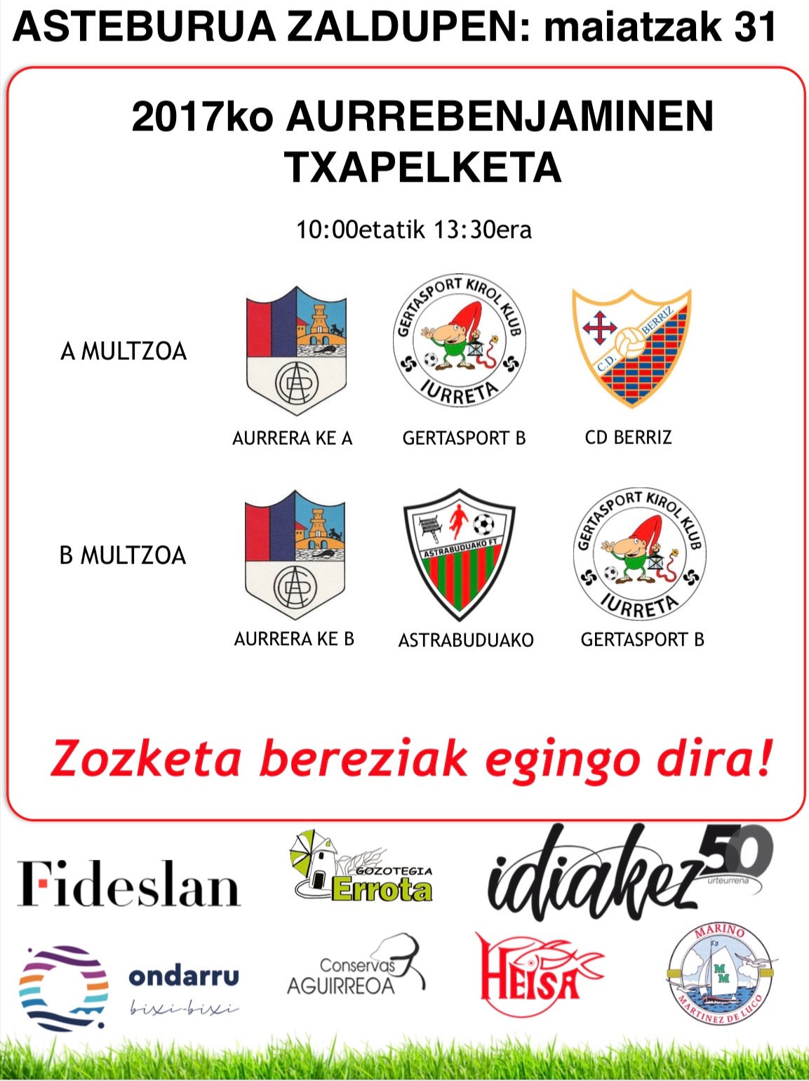 Behian ikusiko dozuenak diz astebukaera honetan Zaldupe udal futbol zelaxan jokatuko dizen partidun egun eta ordutegixak. Aupa AURRERA tra ka tra!
