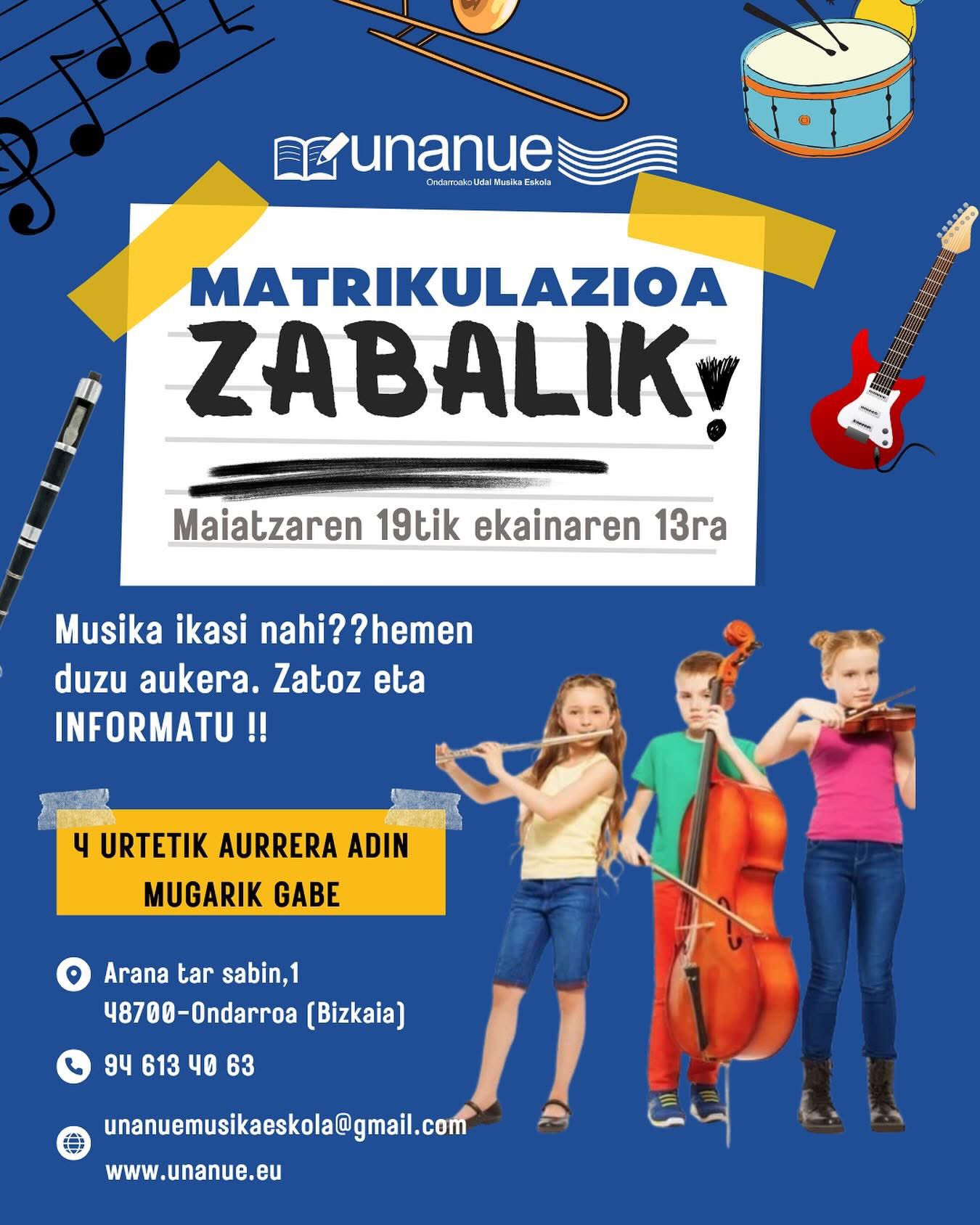 UNANUE udal musikako matrikulaziñoi zabaldu dabe dagoeneko. Ixena emoteko azkan egune ekainak 13e ixango da. Musiki matxe badozu ez galdu aukera hau eta zalantzaren bat euki ezkeo lasai galdetu bertan.