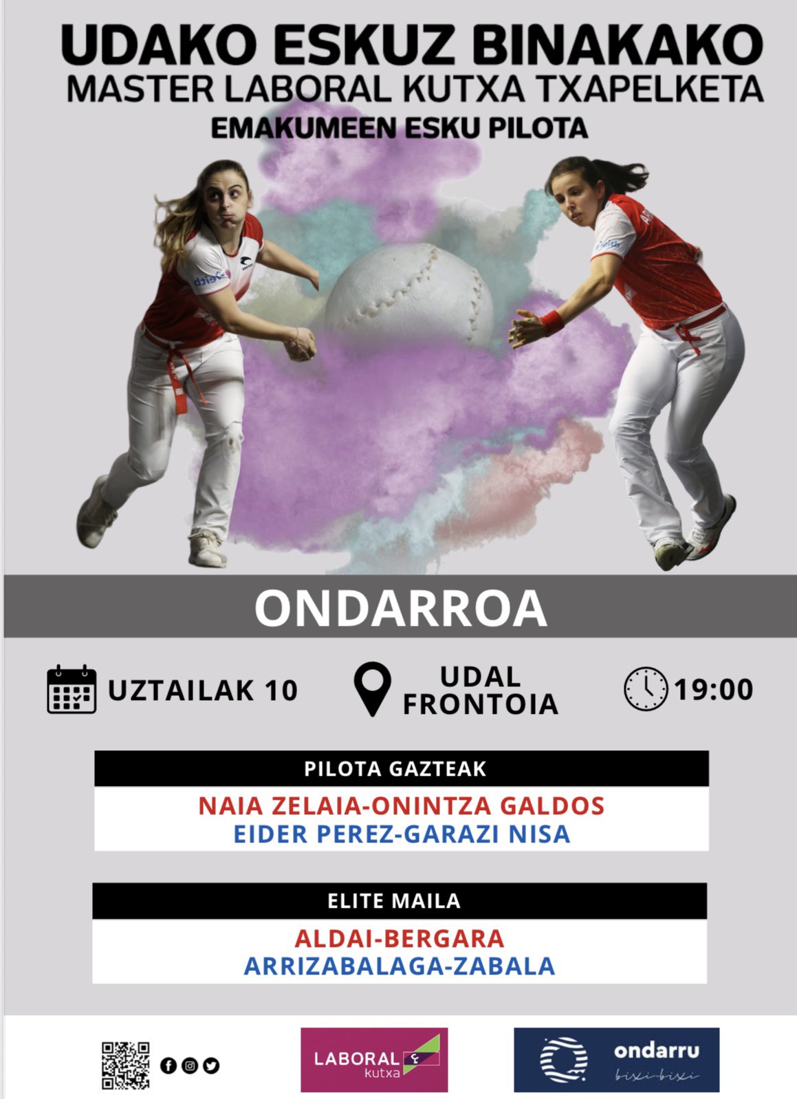 Gaur arratsaldeko 7retan frontoin, Udako eskuz binakako Master Laboral Kutxa txapelketi emakumin esku-pilota partidu. Parte hartuko daben bikotik honek diz: Alde batetik gaztik, NAIA ZELAIA eta ONINTZA GALDOS eta aurkarixak EIDER PEREZ eta GARAZI NISA. Eta elite mallan, ALDAI eta BERGARA ta aurkarixak ARRIZABALAGA ta ZABALA.