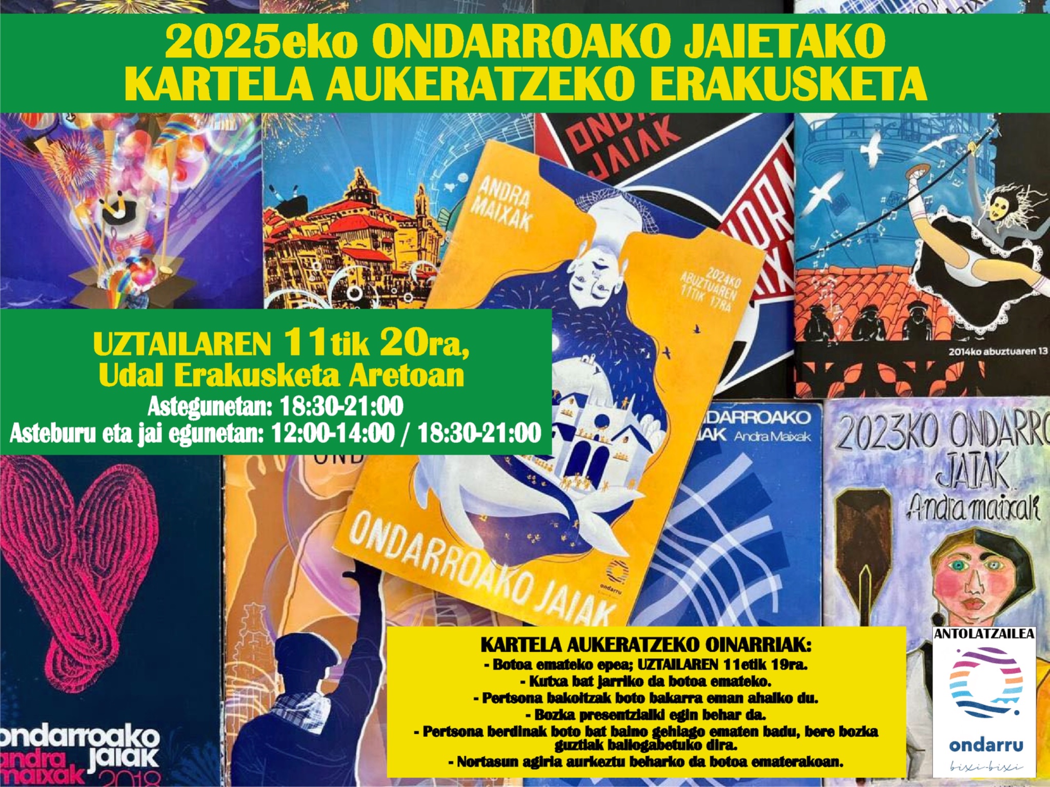 Gaur hasi eta hillan 20 bittartin Udal erakusketa aretun ahalko dou aukeratu aurtengo jaxetako kartela, bertan dazelako aurkeztu dizen lanak. Horretako baldintza batzuk bete birdiz: Pertsona bakotxak boto bakarra ahalko dau bozkatu, Nortasun agirixe erakutsi birde ta Bozki erakusketa aretun bakarrik ahalko da ein. Herrittarrak dakau berbi on, hartu parte!