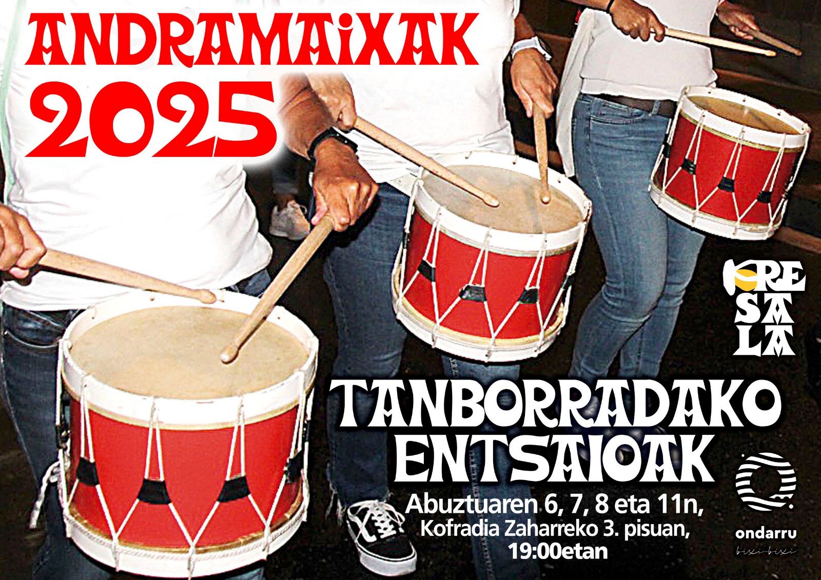 Motorrak berotzen hasitxe daz aurtengo jaxetako ta egitaraun agertzen dan latxeik urteroko tanborradi antolatzen dau KRESALA KULTUR ELKARTIK. Bertan parte hartu ahal ixateko, entsaxuk Abuztuan 6,7,8 eta 11an ixango diz, Kofrai Zaharreko 3.solairun arratsaldeko 7retatik aurrea. Anima eta hartu parte!