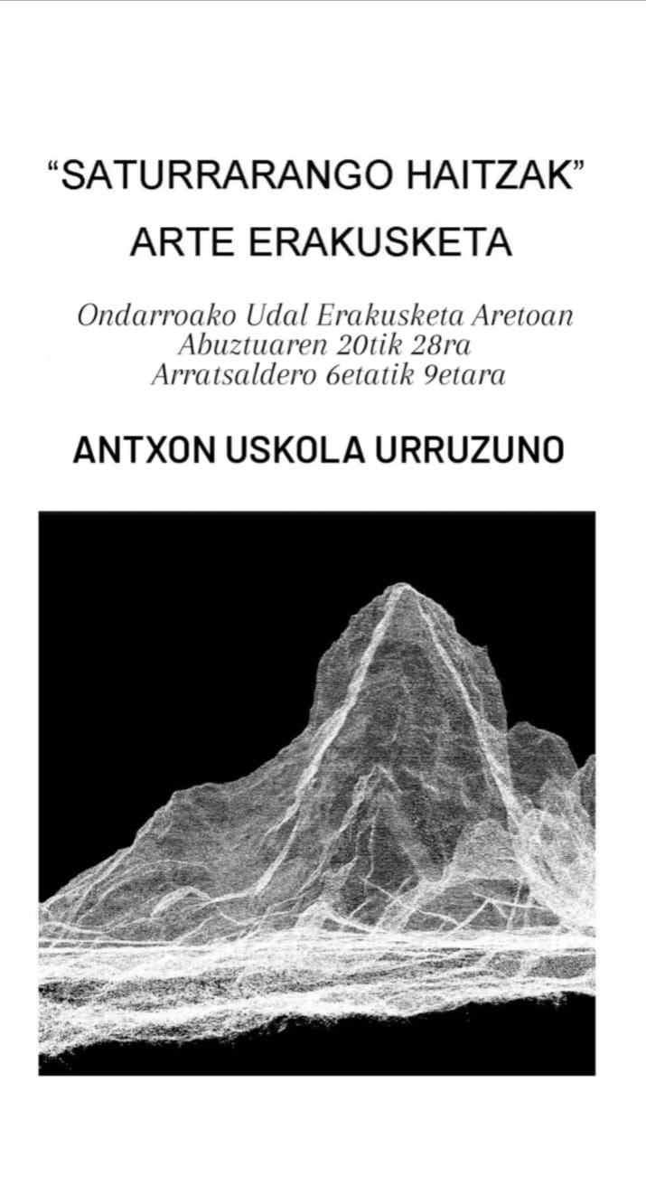 “SATURRARANGO HAITZAK” ixenburupin zabaldu dau gaur erakusketi ANTXON USKOLA URRUZUNO artista ondarrutarrak Udal erakusketa aretun. Gaur hasi eta Abuztuaren 28 bittartin arratsaldeko 6etatik illuntzeko 9eta. Honeaz lotute bixar eguerdiko 12xetan RADIXU irratixan (105,5 FM edo Radixu.info) irratsaio bat presta dabe gai honi buruz beraz batea. Hurreatu arte bidez ezautzea gure inguruk.